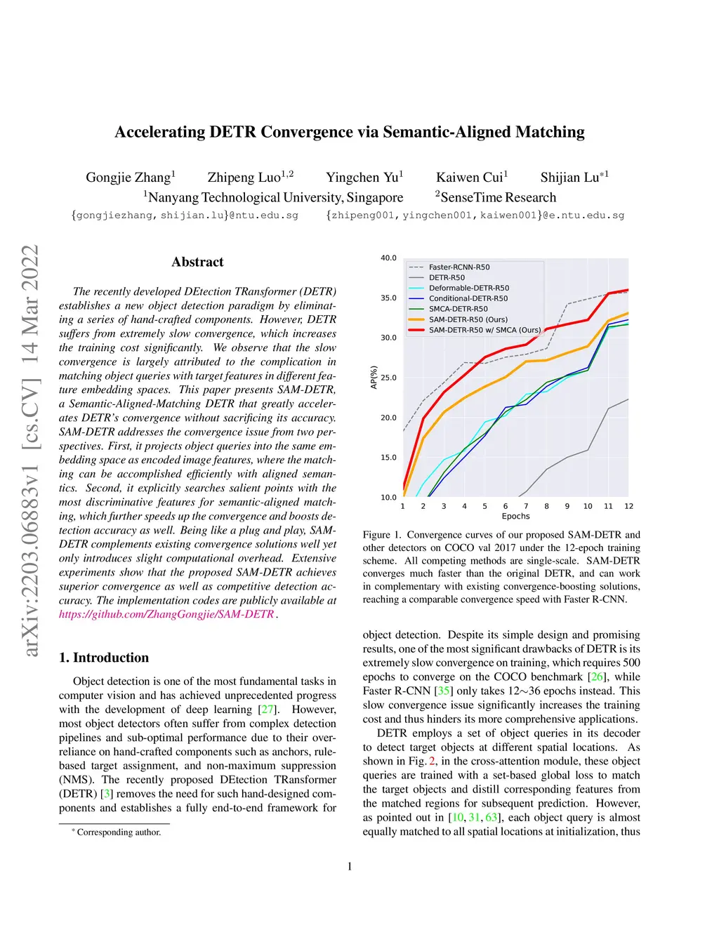 The recently developed DEtection TRansformer (DETR) establishes a new object detection paradigm by eliminating a series of hand-crafted components. However, DETR suffers from extremely slow convergence, which increases the training cost significantly. We observe that the slow convergence is largely attributed to the complication in matching object queries with target features in different feature embedding spaces. This paper presents SAM-DETR, a Semantic-Aligned-Matching DETR that greatly accelerates DETR's convergence without sacrificing its accuracy. SAM-DETR addresses the convergence issue from two perspectives. First, it projects object queries into the same embedding space as encoded image features, where the matching can be accomplished efficiently with aligned semantics. Second, it explicitly searches salient points with the most discriminative features for semantic-aligned matching, which further speeds up the convergence and boosts detection accuracy as well. Being like a plug and play, SAM-DETR complements existing convergence solutions well yet only introduces slight computational overhead. Extensive experiments show that the proposed SAM-DETR achieves superior convergence as well as competitive detection accuracy. The implementation codes are available at https://github.com/ZhangGongjie/SAM-DETR.
