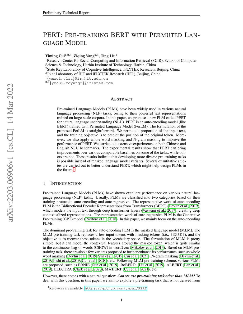 PERT: Pre-training BERT with Permuted Language Model