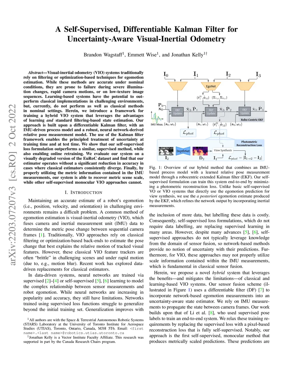 Visual-inertial odometry (VIO) systems traditionally rely on filtering or optimization-based techniques for egomotion estimation. While these methods are accurate under nominal conditions, they are prone to failure during severe illumination changes, rapid camera motions, or on low-texture image sequences. Learning-based systems have the potential to outperform classical implementations in challenging environments, but, currently, do not perform as well as classical methods in nominal settings. Herein, we introduce a framework for training a hybrid VIO system that leverages the advantages of learning and standard filtering-based state estimation. Our approach is built upon a differentiable Kalman filter, with an IMU-driven process model and a robust, neural network-derived relative pose measurement model. The use of the Kalman filter framework enables the principled treatment of uncertainty at training time and at test time. We show that our self-supervised loss formulation outperforms a similar, supervised method, while also enabling online retraining. We evaluate our system on a visually degraded version of the EuRoC dataset and find that our estimator operates without a significant reduction in accuracy in cases where classical estimators consistently diverge. Finally, by properly utilizing the metric information contained in the IMU measurements, our system is able to recover metric scene scale, while other self-supervised monocular VIO approaches cannot.