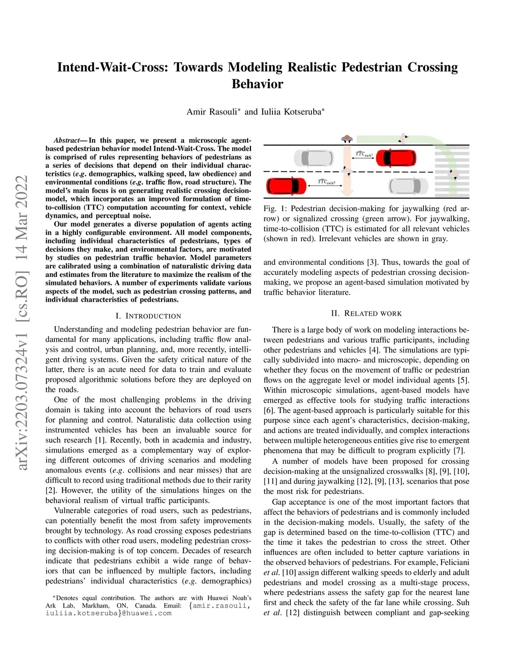 In this paper, we present a microscopic agent-based pedestrian behavior model Intend-Wait-Cross. The model is comprised of rules representing behaviors of pedestrians as a series of decisions that depend on their individual characteristics (e.g. demographics, walking speed, law obedience) and environmental conditions (e.g. traffic flow, road structure). The model's main focus is on generating realistic crossing decision-model, which incorporates an improved formulation of time-to-collision (TTC) computation accounting for context, vehicle dynamics, and perceptual noise. Our model generates a diverse population of agents acting in a highly configurable environment. All model components, including individual characteristics of pedestrians, types of decisions they make, and environmental factors, are motivated by studies on pedestrian traffic behavior. Model parameters are calibrated using a combination of naturalistic driving data and estimates from the literature to maximize the realism of the simulated behaviors. A number of experiments validate various aspects of the model, such as pedestrian crossing patterns, and individual characteristics of pedestrians.