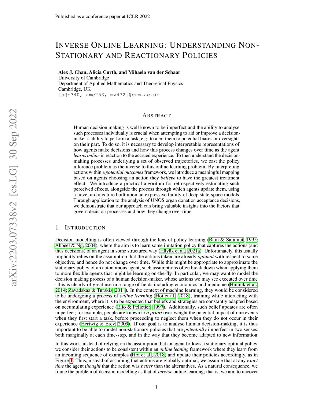 Human decision making is well known to be imperfect and the ability to analyse such processes individually is crucial when attempting to aid or improve a decision-maker's ability to perform a task, e.g. to alert them to potential biases or oversights on their part. To do so, it is necessary to develop interpretable representations of how agents make decisions and how this process changes over time as the agent learns online in reaction to the accrued experience. To then understand the decision-making processes underlying a set of observed trajectories, we cast the policy inference problem as the inverse to this online learning problem. By interpreting actions within a potential outcomes framework, we introduce a meaningful mapping based on agents choosing an action they believe to have the greatest treatment effect. We introduce a practical algorithm for retrospectively estimating such perceived effects, alongside the process through which agents update them, using a novel architecture built upon an expressive family of deep state-space models. Through application to the analysis of UNOS organ donation acceptance decisions, we demonstrate that our approach can bring valuable insights into the factors that govern decision processes and how they change over time.