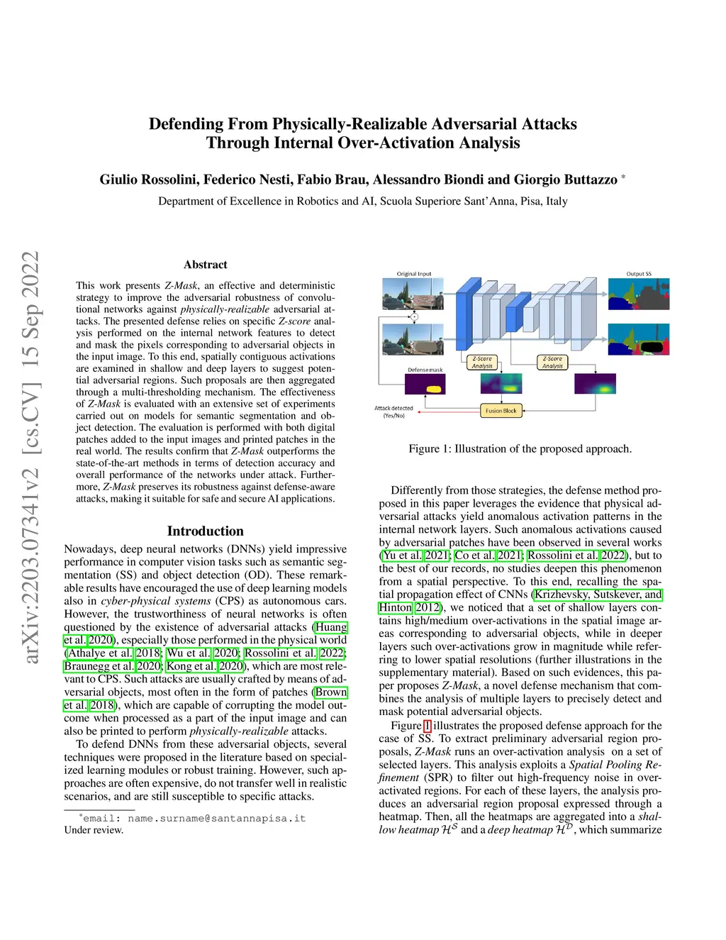 This work presents Z-Mask, a robust and effective strategy to improve the adversarial robustness of convolutional networks against physically-realizable adversarial attacks. The presented defense relies on specific Z-score analysis performed on the internal network features to detect and mask the pixels corresponding to adversarial objects in the input image. To this end, spatially contiguous activations are examined in shallow and deep layers to suggest potential adversarial regions. Such proposals are then aggregated through a multi-thresholding mechanism. The effectiveness of Z-Mask is evaluated with an extensive set of experiments carried out on models for both semantic segmentation and object detection. The evaluation is performed with both digital patches added to the input images and printed patches positioned in the real world. The obtained results confirm that Z-Mask outperforms the state-of-the-art methods in terms of both detection accuracy and overall performance of the networks under attack. Additional experiments showed that Z-Mask is also robust against possible defense-aware attacks.