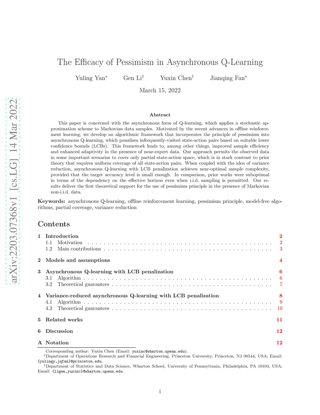 This paper is concerned with the asynchronous form of Q-learning, which applies a stochastic approximation scheme to Markovian data samples. Motivated by the recent advances in offline reinforcement learning, we develop an algorithmic framework that incorporates the principle of pessimism into asynchronous Q-learning, which penalizes infrequently-visited state-action pairs based on suitable lower confidence bounds (LCBs). This framework leads to, among other things, improved sample efficiency and enhanced adaptivity in the presence of near-expert data. Our approach permits the observed data in some important scenarios to cover only partial state-action space, which is in stark contrast to prior theory that requires uniform coverage of all state-action pairs. When coupled with the idea of variance reduction, asynchronous Q-learning with LCB penalization achieves near-optimal sample complexity, provided that the target accuracy level is small enough. In comparison, prior works were suboptimal in terms of the dependency on the effective horizon even when i.i.d. sampling is permitted. Our results deliver the first theoretical support for the use of pessimism principle in the presence of Markovian non-i.i.d. data.