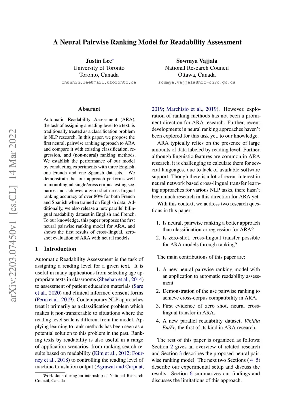 Automatic Readability Assessment (ARA), the task of assigning a reading level to a text, is traditionally treated as a classification problem in NLP research. In this paper, we propose the first neural, pairwise ranking approach to ARA and compare it with existing classification, regression, and (non-neural) ranking methods. We establish the performance of our model by conducting experiments with three English, one French and one Spanish datasets. We demonstrate that our approach performs well in monolingual single/cross corpus testing scenarios and achieves a zero-shot cross-lingual ranking accuracy of over 80% for both French and Spanish when trained on English data. Additionally, we also release a new parallel bilingual readability dataset in English and French. To our knowledge, this paper proposes the first neural pairwise ranking model for ARA, and shows the first results of cross-lingual, zero-shot evaluation of ARA with neural models.
