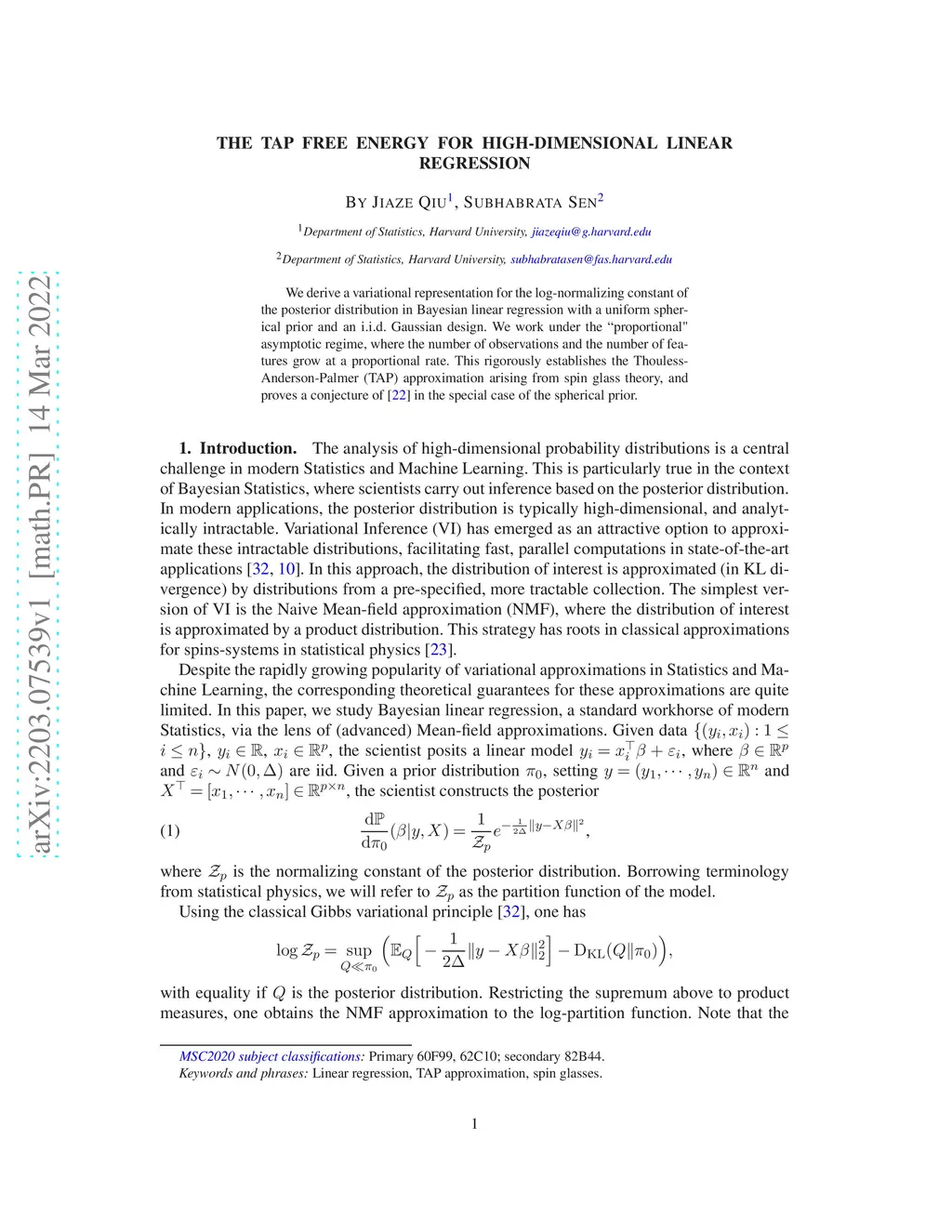 We derive a variational representation for the log-normalizing constant of the posterior distribution in Bayesian linear regression with a uniform spherical prior and an i.i.d. Gaussian design. We work under the "proportional" asymptotic regime, where the number of observations and the number of features grow at a proportional rate. This rigorously establishes the Thouless-Anderson-Palmer (TAP) approximation arising from spin glass theory, and proves a conjecture of Krzakala et. al. (2014) in the special case of the spherical prior.