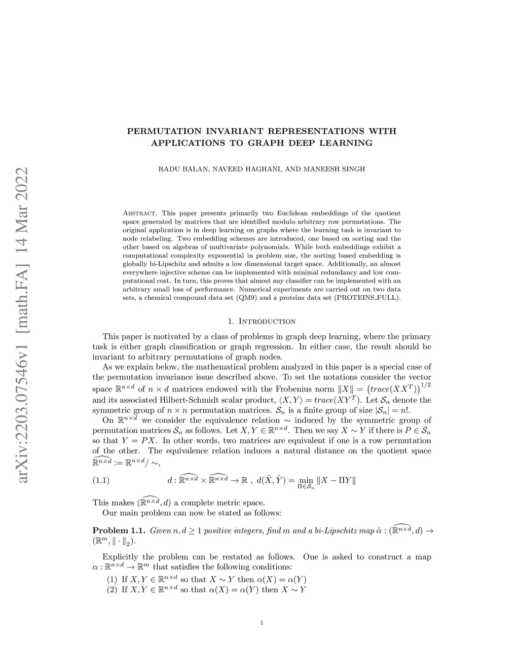 This paper presents primarily two Euclidean embeddings of the quotient space generated by matrices that are identified modulo arbitrary row permutations. The original application is in deep learning on graphs where the learning task is invariant to node relabeling. Two embedding schemes are introduced, one based on sorting and the other based on algebras of multivariate polynomials. While both embeddings exhibit a computational complexity exponential in problem size, the sorting based embedding is globally bi-Lipschitz and admits a low dimensional target space. Additionally, an almost everywhere injective scheme can be implemented with minimal redundancy and low computational cost. In turn, this proves that almost any classifier can be implemented with an arbitrary small loss of performance. Numerical experiments are carried out on two data sets, a chemical compound data set (QM9) and a proteins data set (PROTEINS).