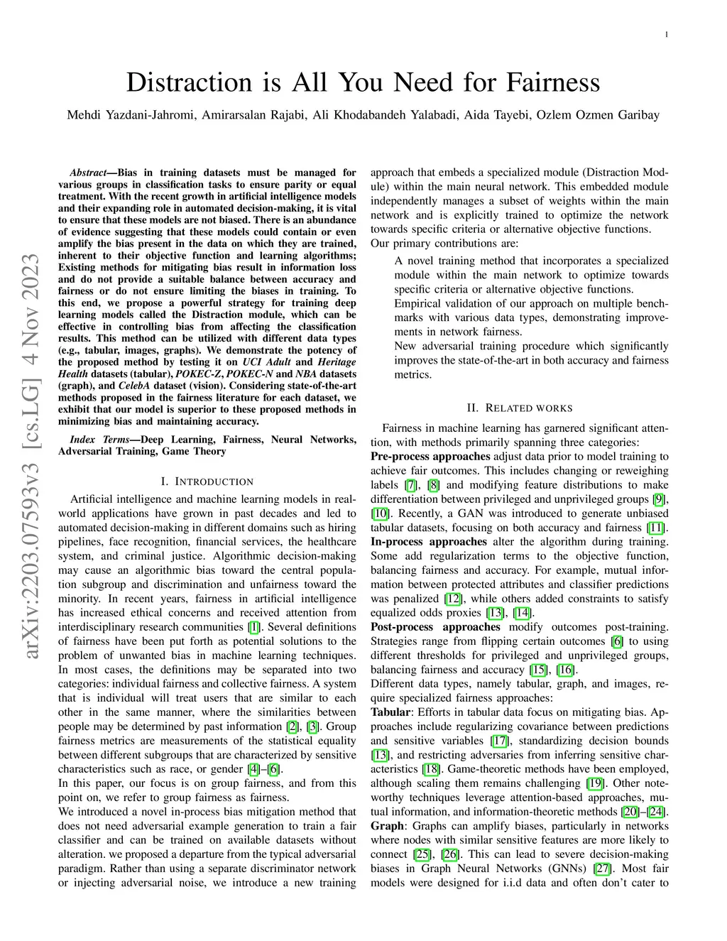 Bias in training datasets must be managed for various groups in classification tasks to ensure parity or equal treatment. With the recent growth in artificial intelligence models and their expanding role in automated decision-making, ensuring that these models are not biased is vital. There is an abundance of evidence suggesting that these models could contain or even amplify the bias present in the data on which they are trained, inherent to their objective function and learning algorithms; Many researchers direct their attention to this issue in different directions, namely, changing data to be statistically independent, adversarial training for restricting the capabilities of a particular competitor who aims to maximize parity, etc. These methods result in information loss and do not provide a suitable balance between accuracy and fairness or do not ensure limiting the biases in training. To this end, we propose a powerful strategy for training deep learning models called the Distraction module, which can be theoretically proven effective in controlling bias from affecting the classification results. This method can be utilized with different data types (e.g., Tabular, images, graphs, etc.). We demonstrate the potency of the proposed method by testing it on UCI Adult and Heritage Health datasets (tabular), POKEC-Z, POKEC-N and NBA datasets (graph), and CelebA dataset (vision). Using state-of-the-art methods proposed in the fairness literature for each dataset, we exhibit our model is superior to these proposed methods in minimizing bias and maintaining accuracy.