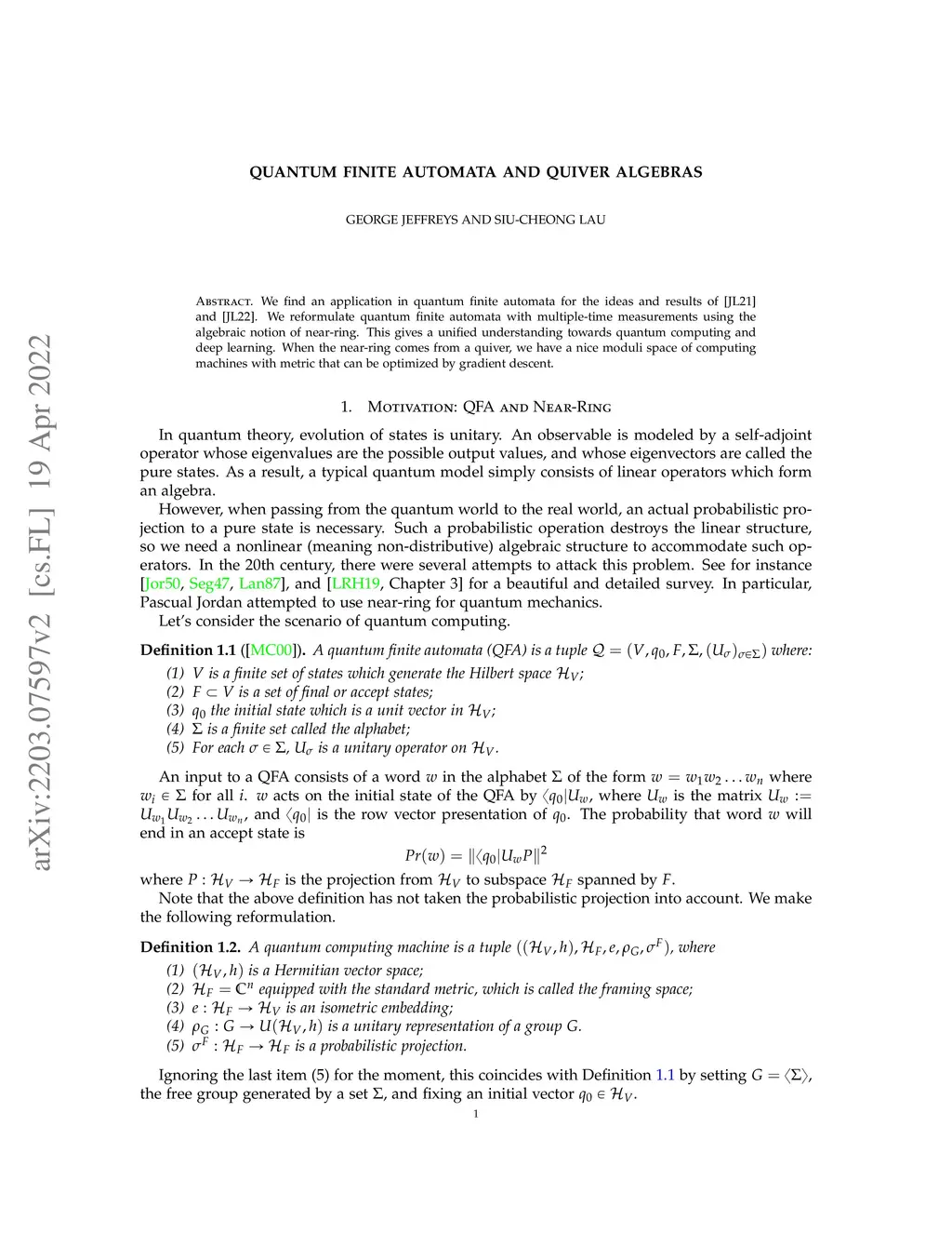 We find an application in quantum finite automata for the ideas and results of [JL21] and [JL22]. We reformulate quantum finite automata with multiple-time measurements using the algebraic notion of near-ring. This gives a unified understanding towards quantum computing and deep learning. When the near-ring comes from a quiver, we have a nice moduli space of computing machines with metric that can be optimized by gradient descent.