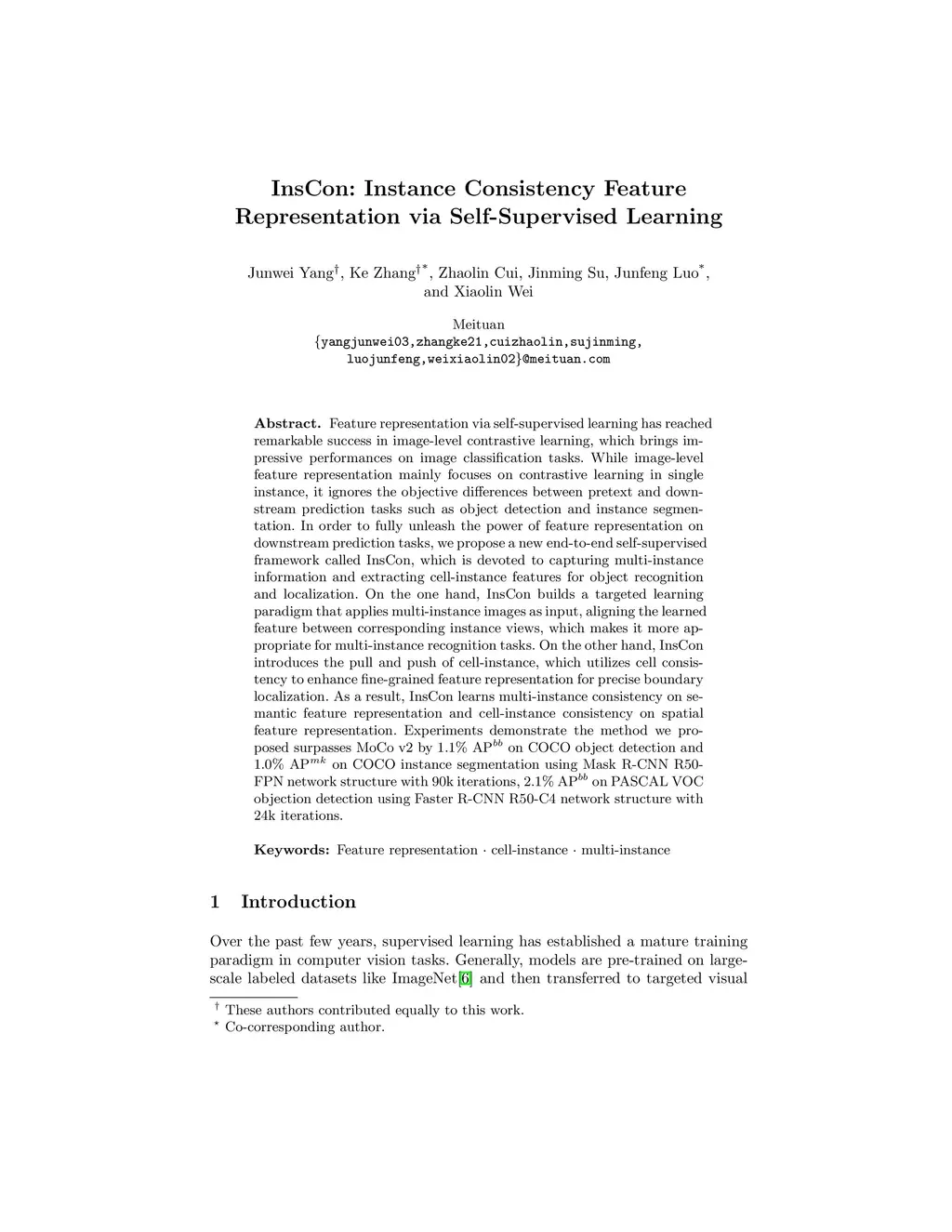 InsCon:Instance Consistency Feature Representation via Self-Supervised