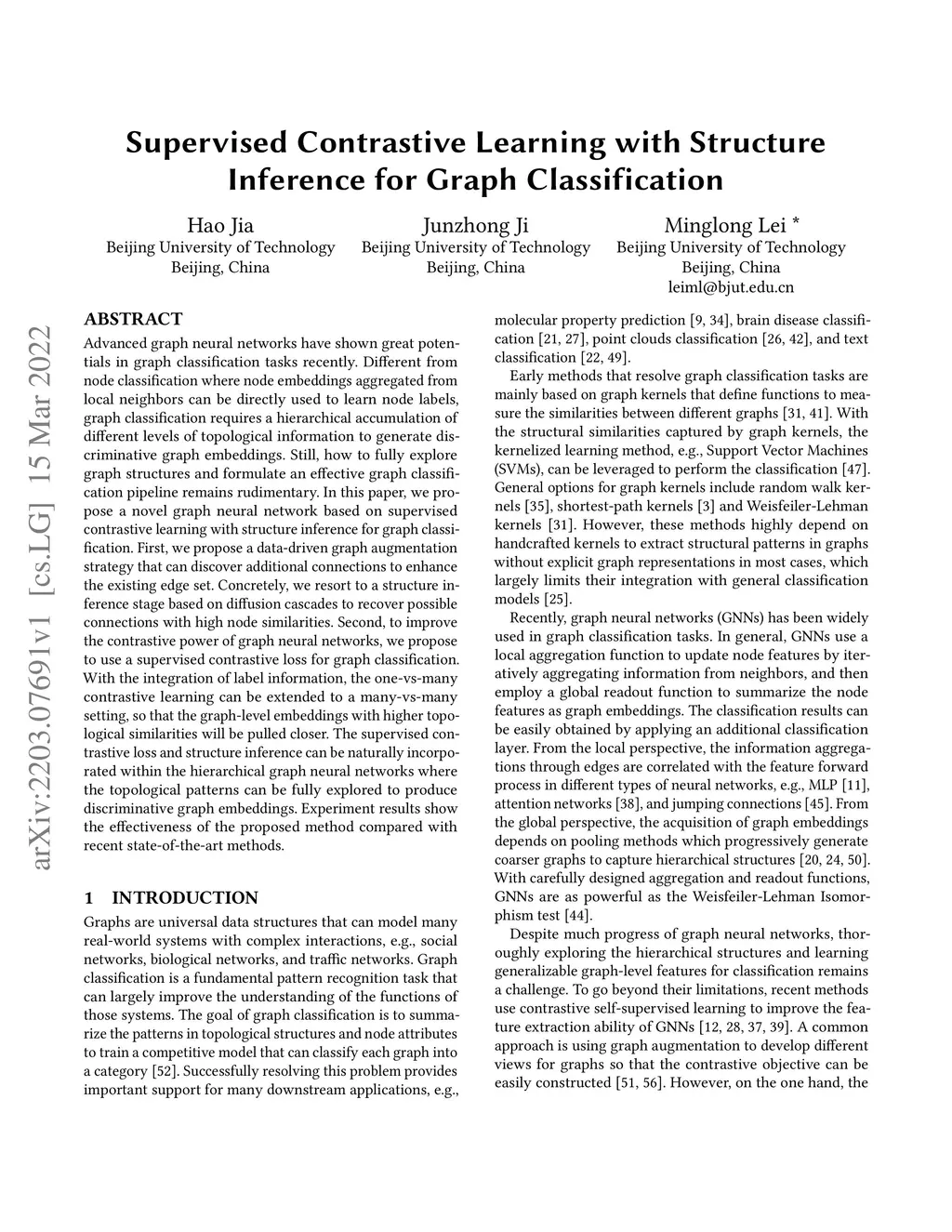 Advanced graph neural networks have shown great potentials in graph classification tasks recently. Different from node classification where node embeddings aggregated from local neighbors can be directly used to learn node labels, graph classification requires a hierarchical accumulation of different levels of topological information to generate discriminative graph embeddings. Still, how to fully explore graph structures and formulate an effective graph classification pipeline remains rudimentary. In this paper, we propose a novel graph neural network based on supervised contrastive learning with structure inference for graph classification. First, we propose a data-driven graph augmentation strategy that can discover additional connections to enhance the existing edge set. Concretely, we resort to a structure inference stage based on diffusion cascades to recover possible connections with high node similarities. Second, to improve the contrastive power of graph neural networks, we propose to use a supervised contrastive loss for graph classification. With the integration of label information, the one-vs-many contrastive learning can be extended to a many-vs-many setting, so that the graph-level embeddings with higher topological similarities will be pulled closer. The supervised contrastive loss and structure inference can be naturally incorporated within the hierarchical graph neural networks where the topological patterns can be fully explored to produce discriminative graph embeddings. Experiment results show the effectiveness of the proposed method compared with recent state-of-the-art methods.