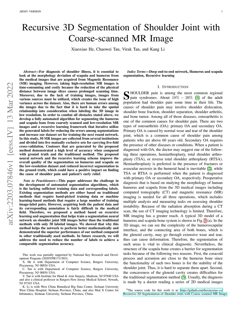 Recursive 3D Segmentation of Shoulder Joint with Coarse-scanned MR Image
