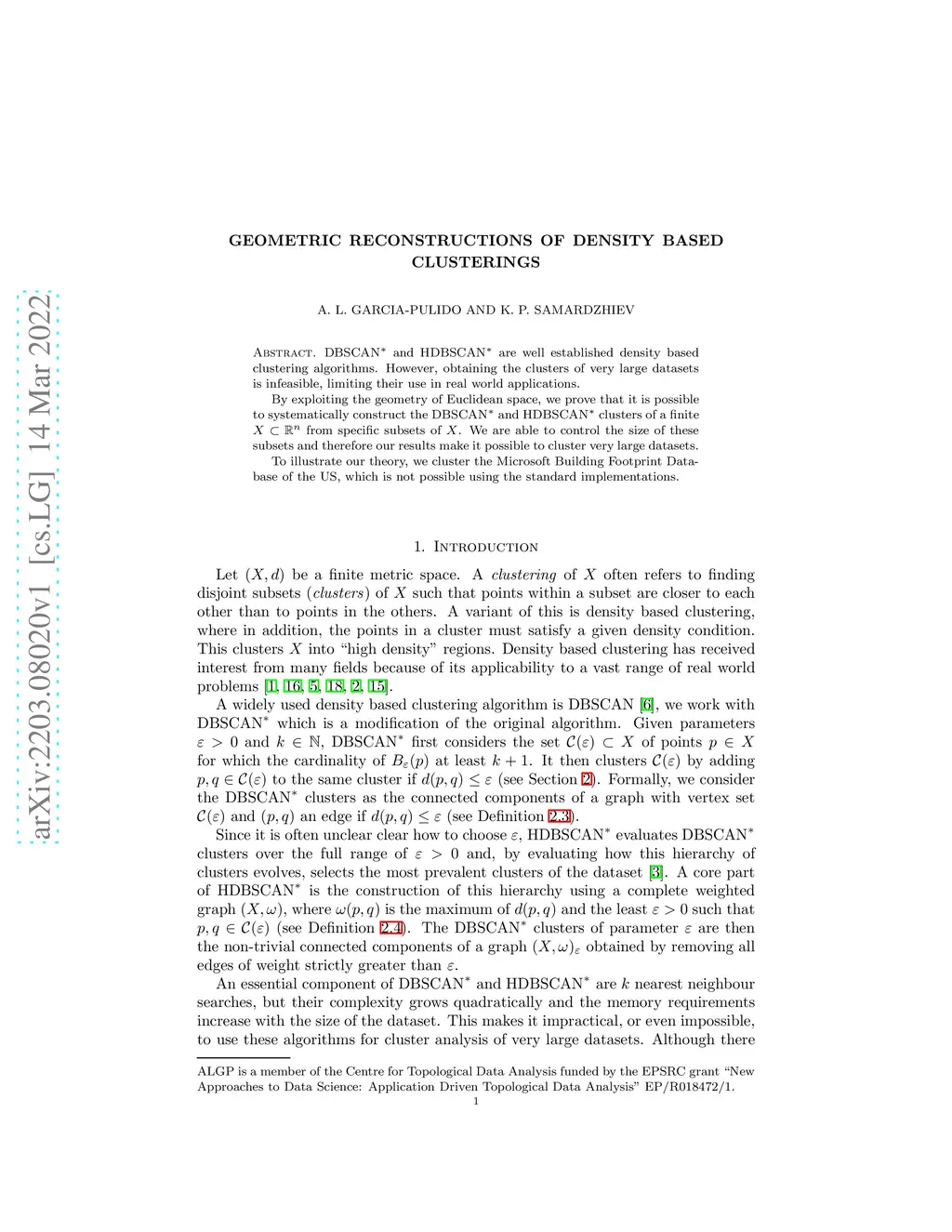 DBSCAN* and HDBSCAN* are well established density based clustering algorithms. However, obtaining the clusters of very large datasets is infeasible, limiting their use in real world applications. By exploiting the geometry of Euclidean space, we prove that it is possible to systematically construct the DBSCAN* and HDBSCAN* clusters of a finite from specific subsets of . We are able to control the size of these subsets and therefore our results make it possible to cluster very large datasets. To illustrate our theory, we cluster the Microsoft Building Footprint Database of the US, which is not possible using the standard implementations.