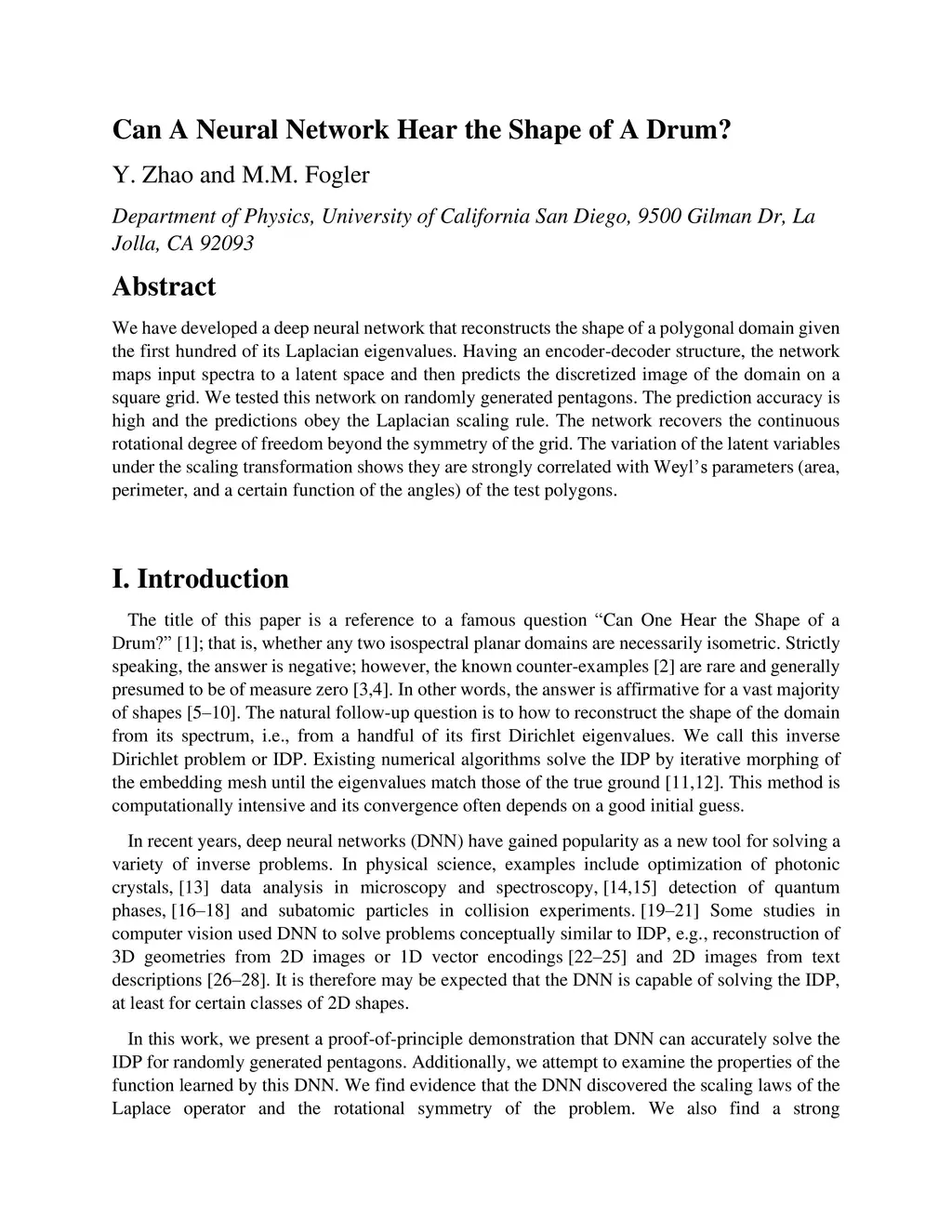 We have developed a deep neural network that reconstructs the shape of a polygonal domain given the first hundred of its Laplacian (or Schrodinger) eigenvalues. Having an encoder-decoder structure, the network maps input spectra to a latent space and then predicts the discretized image of the domain on a square grid. We tested this network on randomly generated pentagons. The prediction accuracy is high and the predictions obey the Laplacian scaling rule. The network recovers the continuous rotational degree of freedom beyond the symmetry of the grid. The variation of the latent variables under the scaling transformation shows they are strongly correlated with Weyl' s parameters (area, perimeter, and a certain function of the angles) of the test polygons.