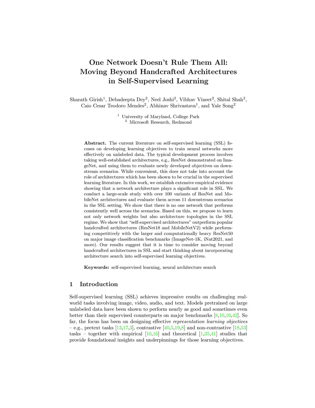 The current literature on self-supervised learning (SSL) focuses on developing learning objectives to train neural networks more effectively on unlabeled data. The typical development process involves taking well-established architectures, e.g., ResNet demonstrated on ImageNet, and using them to evaluate newly developed objectives on downstream scenarios. While convenient, this does not take into account the role of architectures which has been shown to be crucial in the supervised learning literature. In this work, we establish extensive empirical evidence showing that a network architecture plays a significant role in SSL. We conduct a large-scale study with over 100 variants of ResNet and MobileNet architectures and evaluate them across 11 downstream scenarios in the SSL setting. We show that there is no one network that performs consistently well across the scenarios. Based on this, we propose to learn not only network weights but also architecture topologies in the SSL regime. We show that "self-supervised architectures" outperform popular handcrafted architectures (ResNet18 and MobileNetV2) while performing competitively with the larger and computationally heavy ResNet50 on major image classification benchmarks (ImageNet-1K, iNat2021, and more). Our results suggest that it is time to consider moving beyond handcrafted architectures in SSL and start thinking about incorporating architecture search into self-supervised learning objectives.