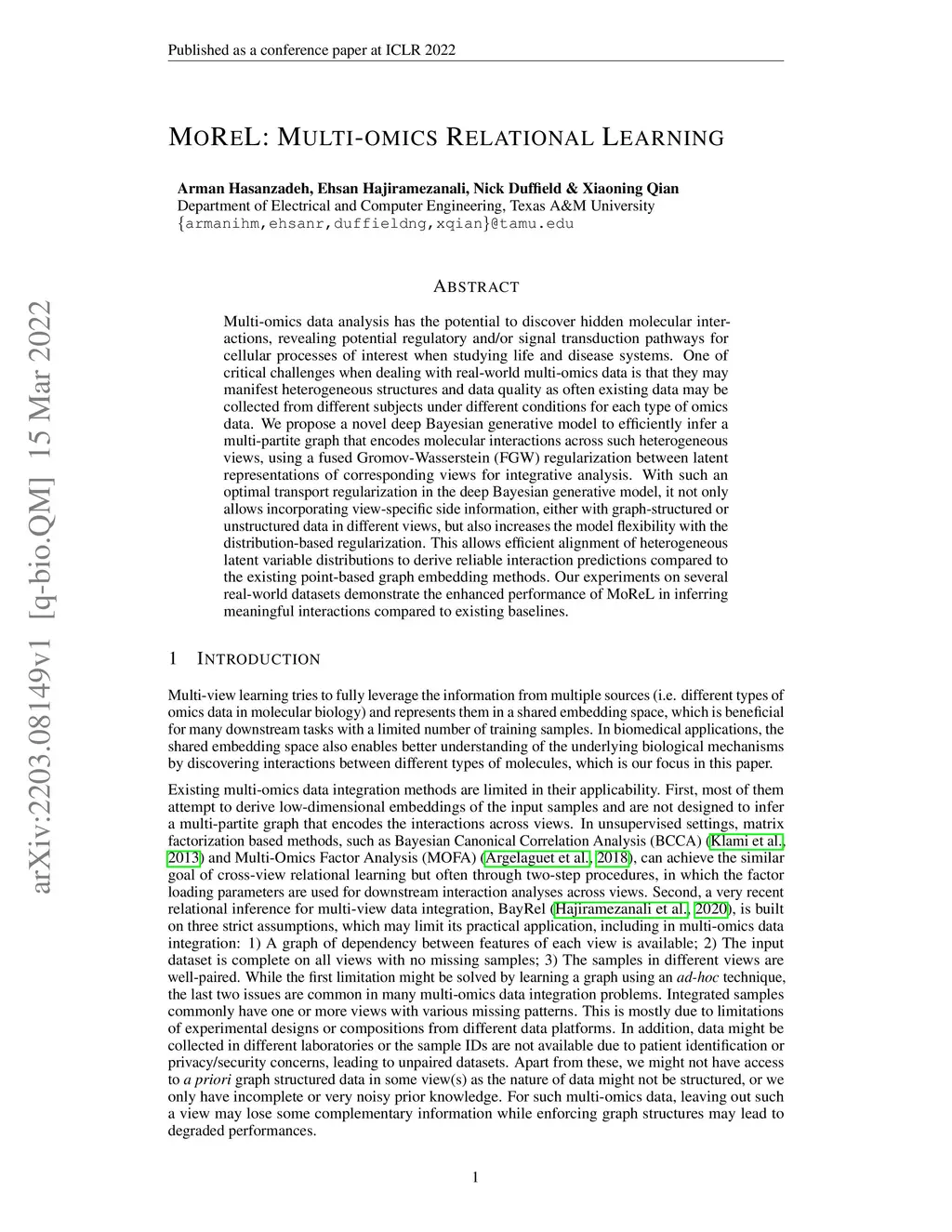Multi-omics data analysis has the potential to discover hidden molecular interactions, revealing potential regulatory and/or signal transduction pathways for cellular processes of interest when studying life and disease systems. One of critical challenges when dealing with real-world multi-omics data is that they may manifest heterogeneous structures and data quality as often existing data may be collected from different subjects under different conditions for each type of omics data. We propose a novel deep Bayesian generative model to efficiently infer a multi-partite graph encoding molecular interactions across such heterogeneous views, using a fused Gromov-Wasserstein (FGW) regularization between latent representations of corresponding views for integrative analysis. With such an optimal transport regularization in the deep Bayesian generative model, it not only allows incorporating view-specific side information, either with graph-structured or unstructured data in different views, but also increases the model flexibility with the distribution-based regularization. This allows efficient alignment of heterogeneous latent variable distributions to derive reliable interaction predictions compared to the existing point-based graph embedding methods. Our experiments on several real-world datasets demonstrate enhanced performance of MoReL in inferring meaningful interactions compared to existing baselines.