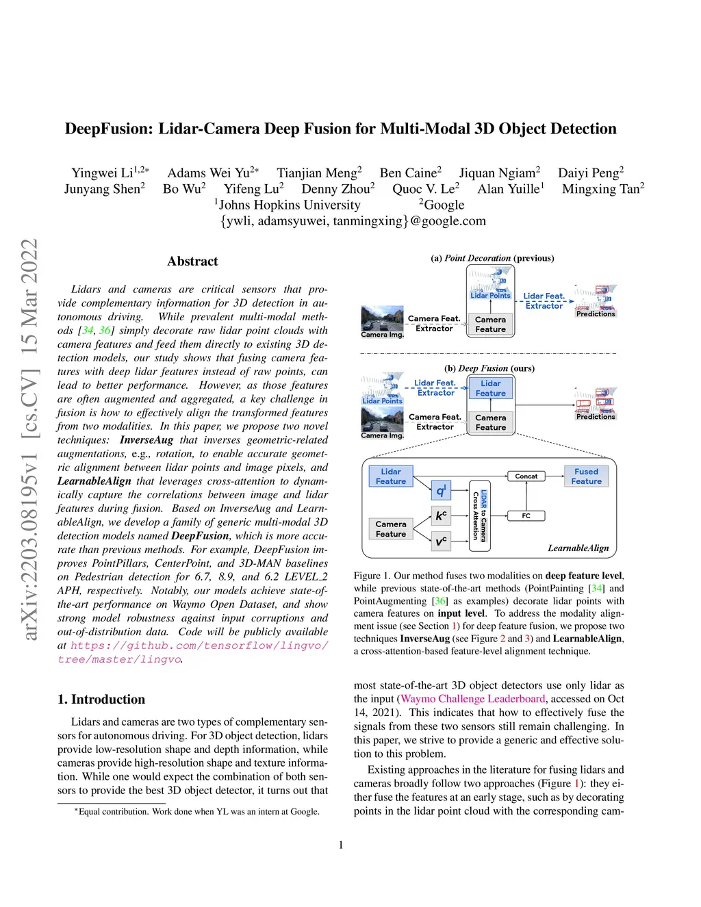 Lidars and cameras are critical sensors that provide complementary information for 3D detection in autonomous driving. While prevalent multi-modal methods simply decorate raw lidar point clouds with camera features and feed them directly to existing 3D detection models, our study shows that fusing camera features with deep lidar features instead of raw points, can lead to better performance. However, as those features are often augmented and aggregated, a key challenge in fusion is how to effectively align the transformed features from two modalities. In this paper, we propose two novel techniques: InverseAug that inverses geometric-related augmentations, e.g., rotation, to enable accurate geometric alignment between lidar points and image pixels, and LearnableAlign that leverages cross-attention to dynamically capture the correlations between image and lidar features during fusion. Based on InverseAug and LearnableAlign, we develop a family of generic multi-modal 3D detection models named DeepFusion, which is more accurate than previous methods. For example, DeepFusion improves PointPillars, CenterPoint, and 3D-MAN baselines on Pedestrian detection for 6.7, 8.9, and 6.2 LEVEL_2 APH, respectively. Notably, our models achieve state-of-the-art performance on Waymo Open Dataset, and show strong model robustness against input corruptions and out-of-distribution data. Code will be publicly available at https://github.com/tensorflow/lingvo/tree/master/lingvo/.