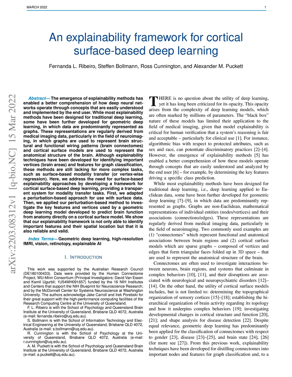 The emergence of explainability methods has enabled a better comprehension of how deep neural networks operate through concepts that are easily understood and implemented by the end user. While most explainability methods have been designed for traditional deep learning, some have been further developed for geometric deep learning, in which data are predominantly represented as graphs. These representations are regularly derived from medical imaging data, particularly in the field of neuroimaging, in which graphs are used to represent brain structural and functional wiring patterns (brain connectomes) and cortical surface models are used to represent the anatomical structure of the brain. Although explainability techniques have been developed for identifying important vertices (brain areas) and features for graph classification, these methods are still lacking for more complex tasks, such as surface-based modality transfer (or vertex-wise regression). Here, we address the need for surface-based explainability approaches by developing a framework for cortical surface-based deep learning, providing a transparent system for modality transfer tasks. First, we adapted a perturbation-based approach for use with surface data. Then, we applied our perturbation-based method to investigate the key features and vertices used by a geometric deep learning model developed to predict brain function from anatomy directly on a cortical surface model. We show that our explainability framework is not only able to identify important features and their spatial location but that it is also reliable and valid.
