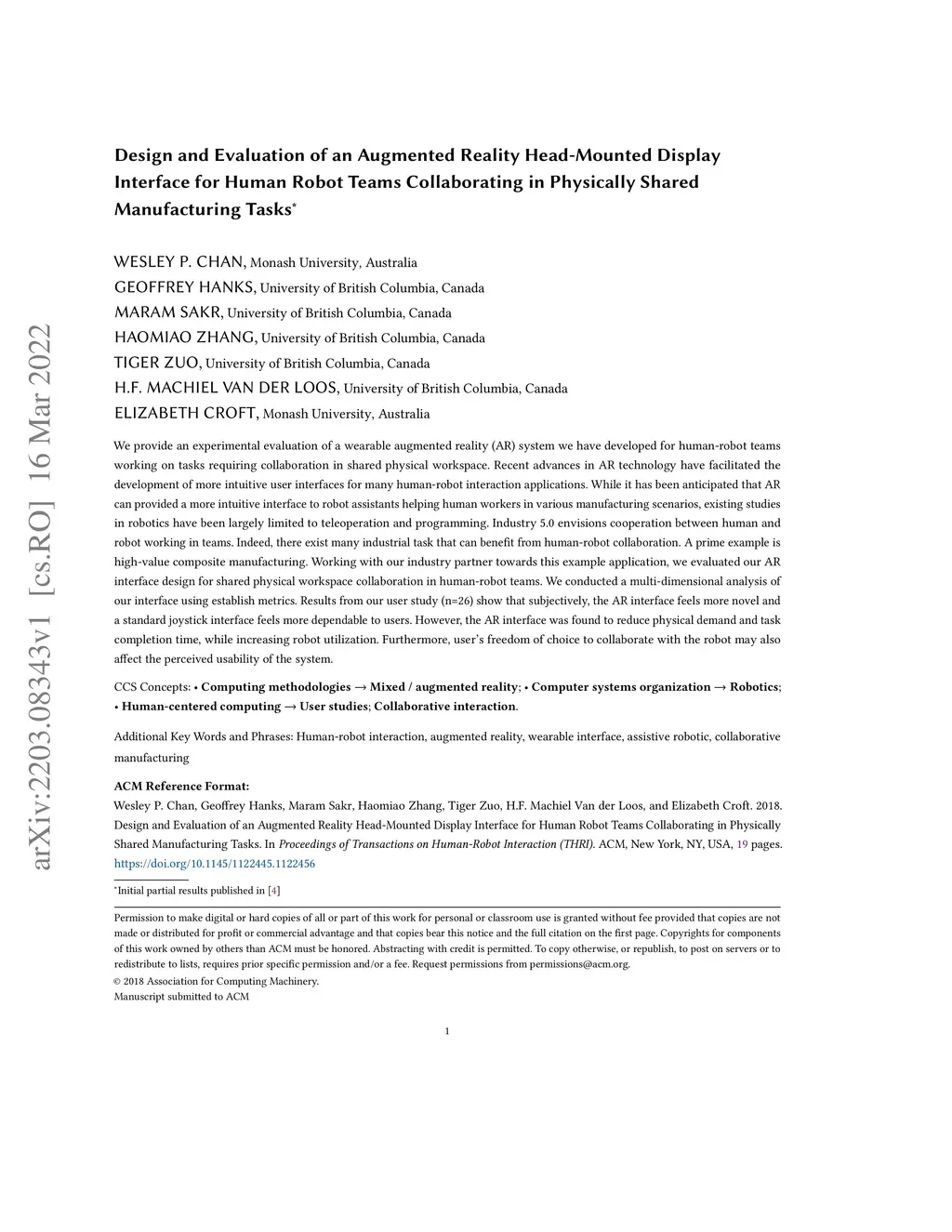 We provide an experimental evaluation of a wearable augmented reality (AR) system we have developed for human-robot teams working on tasks requiring collaboration in shared physical workspace. Recent advances in AR technology have facilitated the development of more intuitive user interfaces for many human-robot interaction applications. While it has been anticipated that AR can provided a more intuitive interface to robot assistants helping human workers in various manufacturing scenarios, existing studies in robotics have been largely limited to teleoperation and programming. Industry 5.0 envisions cooperation between human and robot working in teams. Indeed, there exist many industrial task that can benefit from human-robot collaboration. A prime example is high-value composite manufacturing. Working with our industry partner towards this example application, we evaluated our AR interface design for shared physical workspace collaboration in human-robot teams. We conducted a multi-dimensional analysis of our interface using establish metrics. Results from our user study (n=26) show that subjectively, the AR interface feels more novel and a standard joystick interface feels more dependable to users. However, the AR interface was found to reduce physical demand and task completion time, while increasing robot utilization. Furthermore, user's freedom of choice to collaborate with the robot may also affect the perceived usability of the system.