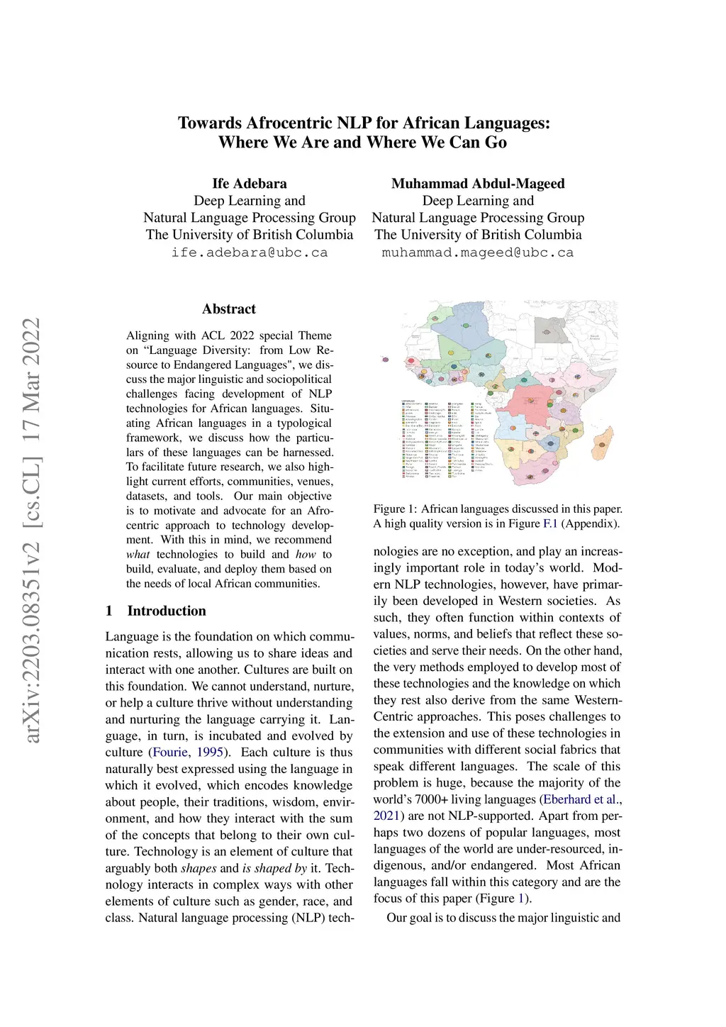 Aligning with ACL 2022 special Theme on "Language Diversity: from Low Resource to Endangered Languages", we discuss the major linguistic and sociopolitical challenges facing development of NLP technologies for African languages. Situating African languages in a typological framework, we discuss how the particulars of these languages can be harnessed. To facilitate future research, we also highlight current efforts, communities, venues, datasets, and tools. Our main objective is to motivate and advocate for an Afrocentric approach to technology development. With this in mind, we recommend \textit{what} technologies to build and \textit{how} to build, evaluate, and deploy them based on the needs of local African communities.