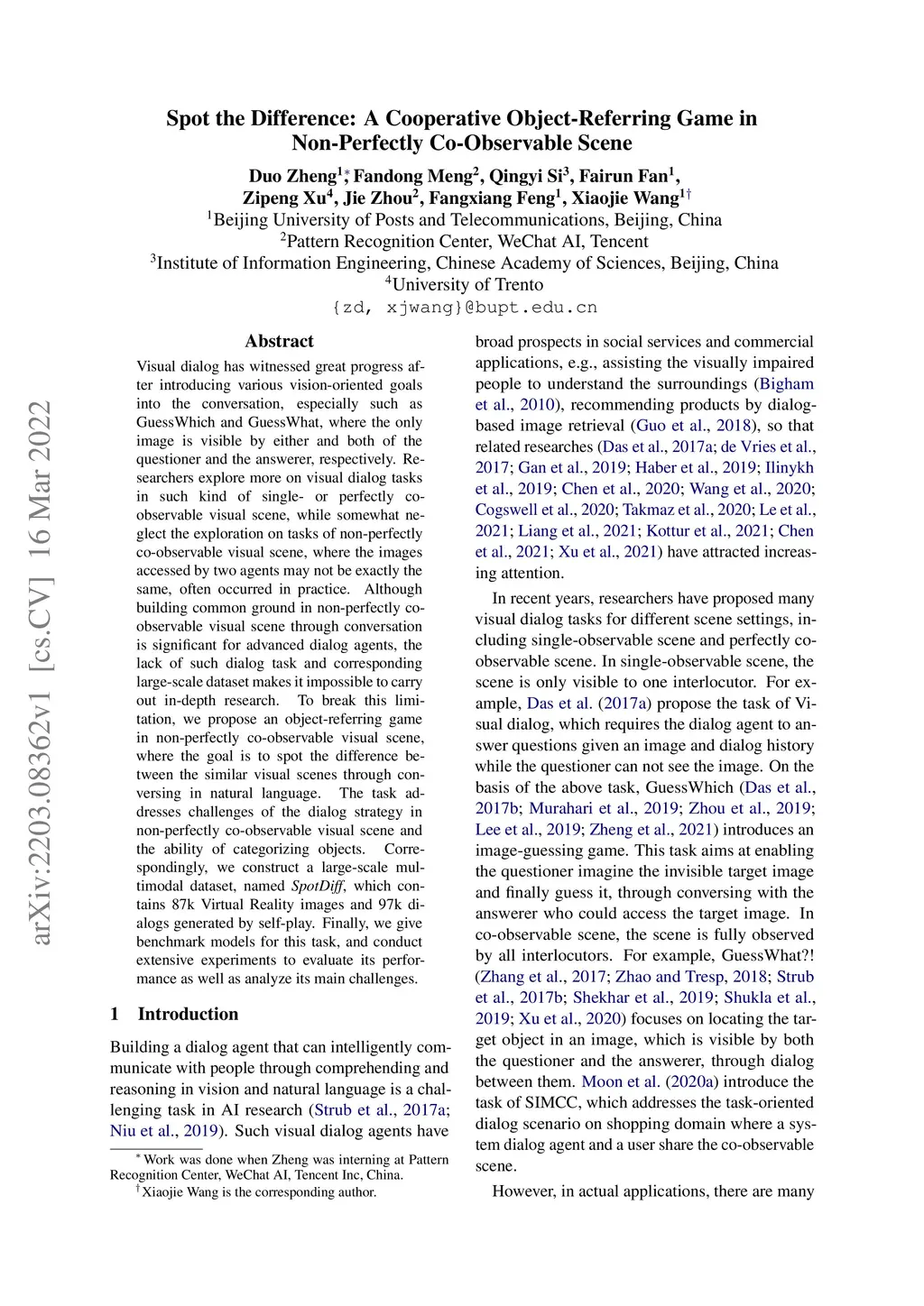 Visual dialog has witnessed great progress after introducing various vision-oriented goals into the conversation, especially such as GuessWhich and GuessWhat, where the only image is visible by either and both of the questioner and the answerer, respectively. Researchers explore more on visual dialog tasks in such kind of single- or perfectly co-observable visual scene, while somewhat neglect the exploration on tasks of non perfectly co-observable visual scene, where the images accessed by two agents may not be exactly the same, often occurred in practice. Although building common ground in non-perfectly co-observable visual scene through conversation is significant for advanced dialog agents, the lack of such dialog task and corresponding large-scale dataset makes it impossible to carry out in-depth research. To break this limitation, we propose an object-referring game in non-perfectly co-observable visual scene, where the goal is to spot the difference between the similar visual scenes through conversing in natural language. The task addresses challenges of the dialog strategy in non-perfectly co-observable visual scene and the ability of categorizing objects. Correspondingly, we construct a large-scale multimodal dataset, named SpotDiff, which contains 87k Virtual Reality images and 97k dialogs generated by self-play. Finally, we give benchmark models for this task, and conduct extensive experiments to evaluate its performance as well as analyze its main challenges.