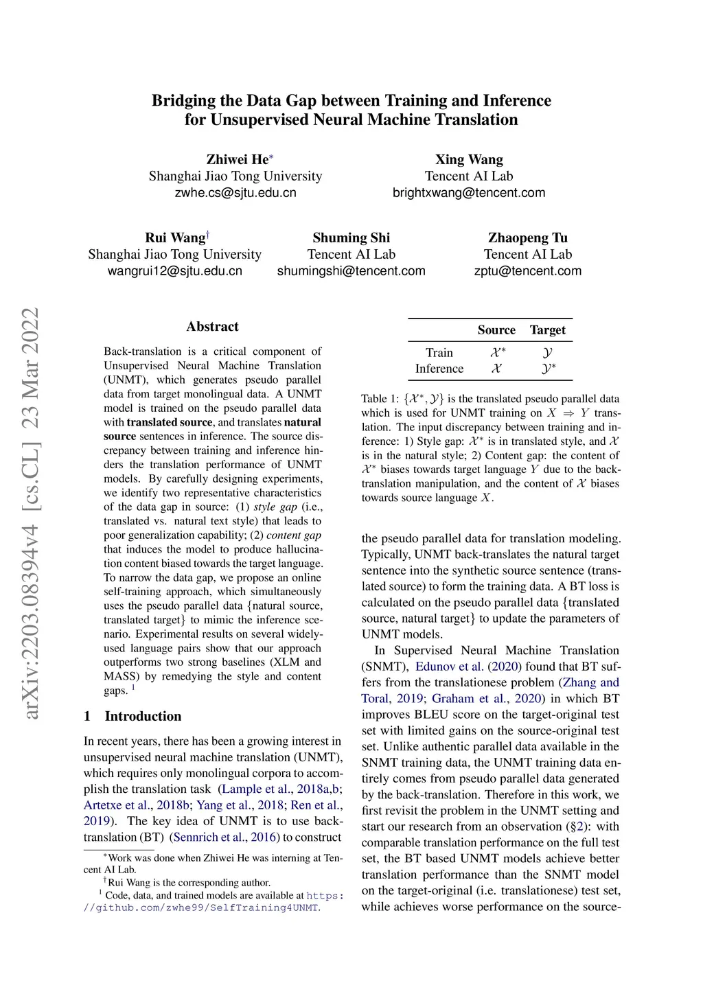 Back-translation is a critical component of Unsupervised Neural Machine Translation (UNMT), which generates pseudo parallel data from target monolingual data. A UNMT model is trained on the pseudo parallel data with translated source, and translates natural source sentences in inference. The source discrepancy between training and inference hinders the translation performance of UNMT models. By carefully designing experiments, we identify two representative characteristics of the data gap in source: (1) style gap (i.e., translated vs. natural text style) that leads to poor generalization capability; (2) content gap that induces the model to produce hallucination content biased towards the target language. To narrow the data gap, we propose an online self-training approach, which simultaneously uses the pseudo parallel data {natural source, translated target} to mimic the inference scenario. Experimental results on several widely-used language pairs show that our approach outperforms two strong baselines (XLM and MASS) by remedying the style and content gaps.