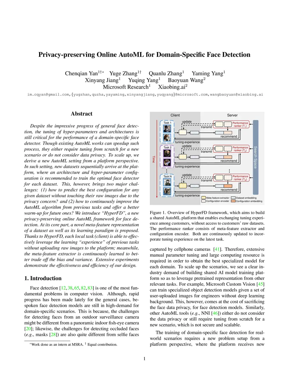 Despite the impressive progress of general face detection, the tuning of hyper-parameters and architectures is still critical for the performance of a domain-specific face detector. Though existing AutoML works can speedup such process, they either require tuning from scratch for a new scenario or do not consider data privacy. To scale up, we derive a new AutoML setting from a platform perspective. In such setting, new datasets sequentially arrive at the platform, where an architecture and hyper-parameter configuration is recommended to train the optimal face detector for each dataset. This, however, brings two major challenges: (1) how to predict the best configuration for any given dataset without touching their raw images due to the privacy concern? and (2) how to continuously improve the AutoML algorithm from previous tasks and offer a better warm-up for future ones? We introduce "HyperFD", a new privacy-preserving online AutoML framework for face detection. At its core part, a novel meta-feature representation of a dataset as well as its learning paradigm is proposed. Thanks to HyperFD, each local task (client) is able to effectively leverage the learning "experience" of previous tasks without uploading raw images to the platform; meanwhile, the meta-feature extractor is continuously learned to better trade off the bias and variance. Extensive experiments demonstrate the effectiveness and efficiency of our design.