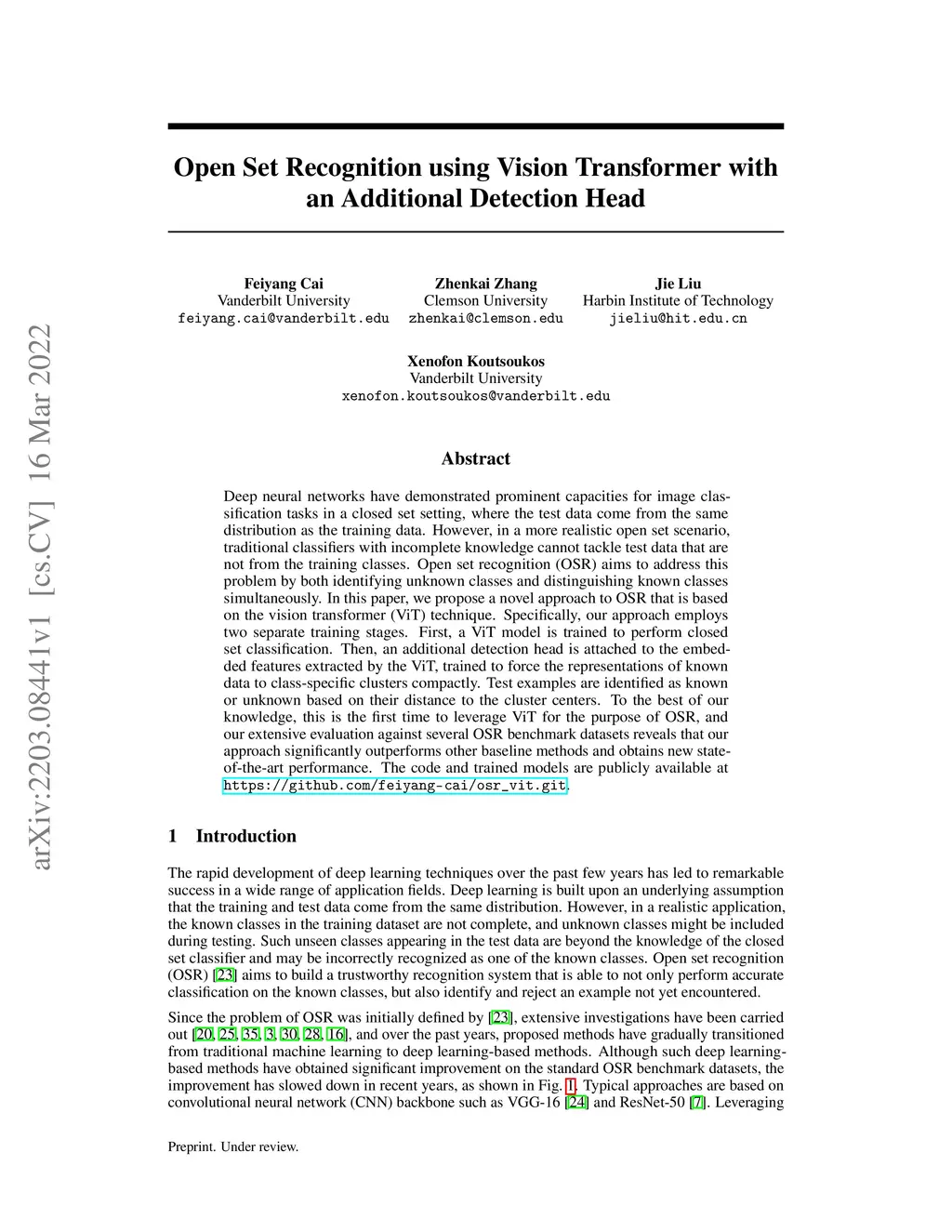 Open Set Recognition using Vision Transformer with an Additional
