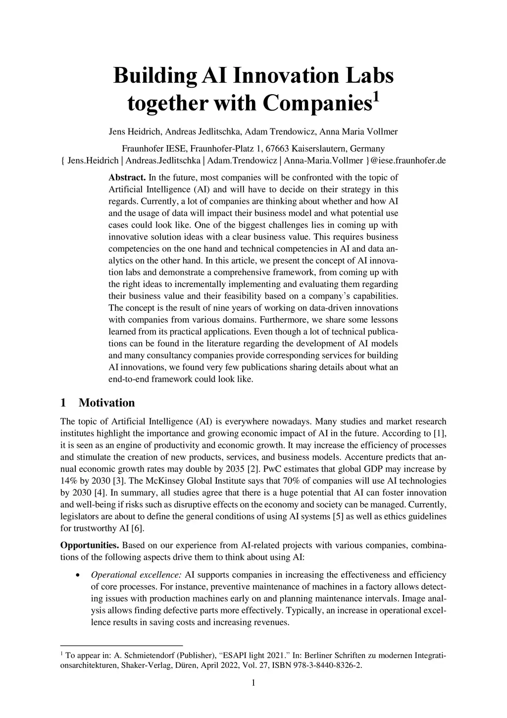 In the future, most companies will be confronted with the topic of Artificial Intelligence (AI) and will have to decide on their strategy in this regards. Currently, a lot of companies are thinking about whether and how AI and the usage of data will impact their business model and what potential use cases could look like. One of the biggest challenges lies in coming up with innovative solution ideas with a clear business value. This requires business competencies on the one hand and technical competencies in AI and data analytics on the other hand. In this article, we present the concept of AI innovation labs and demonstrate a comprehensive framework, from coming up with the right ideas to incrementally implementing and evaluating them regarding their business value and their feasibility based on a company's capabilities. The concept is the result of nine years of working on data-driven innovations with companies from various domains. Furthermore, we share some lessons learned from its practical applications. Even though a lot of technical publications can be found in the literature regarding the development of AI models and many consultancy companies provide corresponding services for building AI innovations, we found very few publications sharing details about what an end-to-end framework could look like.