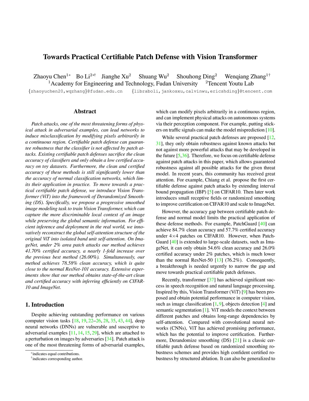 Patch attacks, one of the most threatening forms of physical attack in adversarial examples, can lead networks to induce misclassification by modifying pixels arbitrarily in a continuous region. Certifiable patch defense can guarantee robustness that the classifier is not affected by patch attacks. Existing certifiable patch defenses sacrifice the clean accuracy of classifiers and only obtain a low certified accuracy on toy datasets. Furthermore, the clean and certified accuracy of these methods is still significantly lower than the accuracy of normal classification networks, which limits their application in practice. To move towards a practical certifiable patch defense, we introduce Vision Transformer (ViT) into the framework of Derandomized Smoothing (DS). Specifically, we propose a progressive smoothed image modeling task to train Vision Transformer, which can capture the more discriminable local context of an image while preserving the global semantic information. For efficient inference and deployment in the real world, we innovatively reconstruct the global self-attention structure of the original ViT into isolated band unit self-attention. On ImageNet, under 2% area patch attacks our method achieves 41.70% certified accuracy, a nearly 1-fold increase over the previous best method (26.00%). Simultaneously, our method achieves 78.58% clean accuracy, which is quite close to the normal ResNet-101 accuracy. Extensive experiments show that our method obtains state-of-the-art clean and certified accuracy with inferring efficiently on CIFAR-10 and ImageNet.