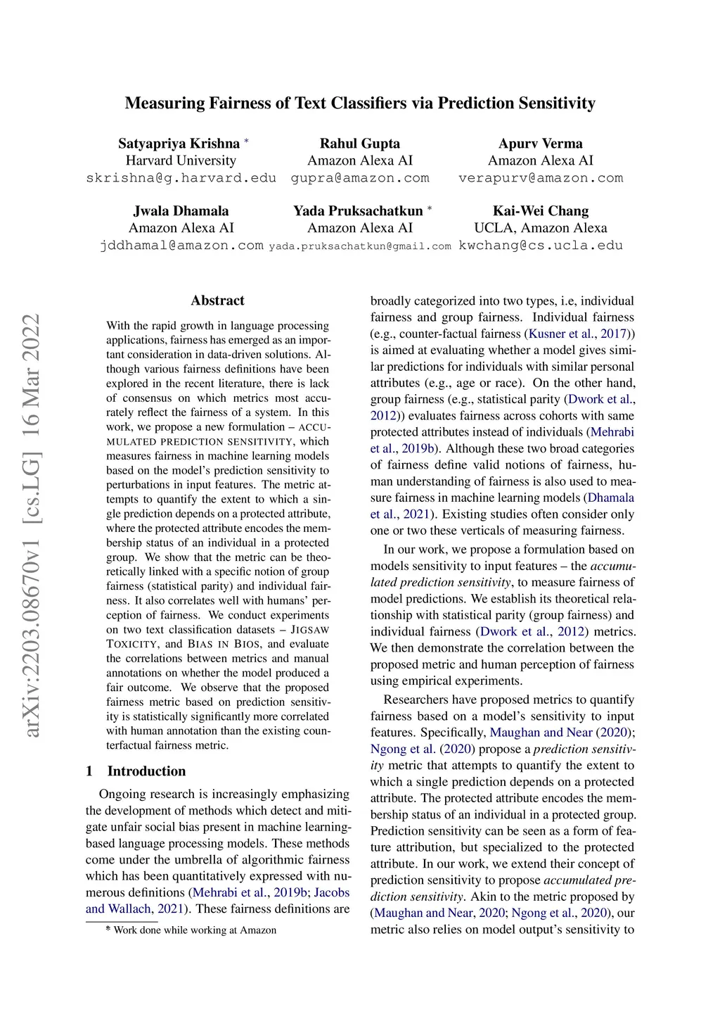 With the rapid growth in language processing applications, fairness has emerged as an important consideration in data-driven solutions. Although various fairness definitions have been explored in the recent literature, there is lack of consensus on which metrics most accurately reflect the fairness of a system. In this work, we propose a new formulation : ACCUMULATED PREDICTION SENSITIVITY, which measures fairness in machine learning models based on the model's prediction sensitivity to perturbations in input features. The metric attempts to quantify the extent to which a single prediction depends on a protected attribute, where the protected attribute encodes the membership status of an individual in a protected group. We show that the metric can be theoretically linked with a specific notion of group fairness (statistical parity) and individual fairness. It also correlates well with humans' perception of fairness. We conduct experiments on two text classification datasets : JIGSAW TOXICITY, and BIAS IN BIOS, and evaluate the correlations between metrics and manual annotations on whether the model produced a fair outcome. We observe that the proposed fairness metric based on prediction sensitivity is statistically significantly more correlated with human annotation than the existing counterfactual fairness metric.