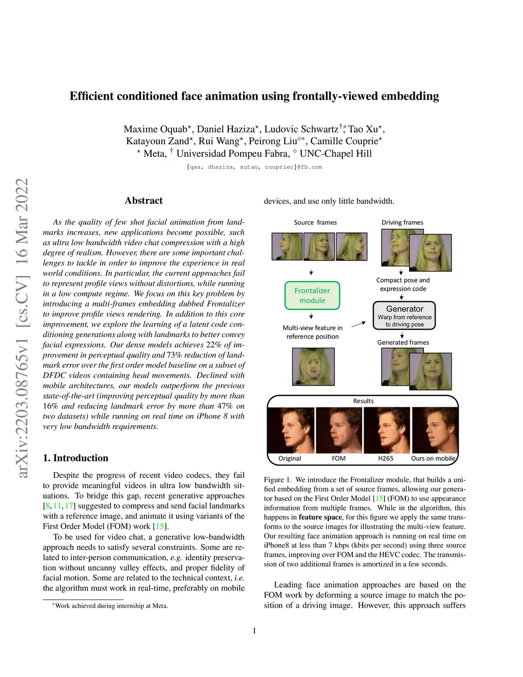 As the quality of few shot facial animation from landmarks increases, new applications become possible, such as ultra low bandwidth video chat compression with a high degree of realism. However, there are some important challenges to tackle in order to improve the experience in real world conditions. In particular, the current approaches fail to represent profile views without distortions, while running in a low compute regime. We focus on this key problem by introducing a multi-frames embedding dubbed Frontalizer to improve profile views rendering. In addition to this core improvement, we explore the learning of a latent code conditioning generations along with landmarks to better convey facial expressions. Our dense models achieves 22% of improvement in perceptual quality and 73% reduction of landmark error over the first order model baseline on a subset of DFDC videos containing head movements. Declined with mobile architectures, our models outperform the previous state-of-the-art (improving perceptual quality by more than 16% and reducing landmark error by more than 47% on two datasets) while running on real time on iPhone 8 with very low bandwidth requirements.