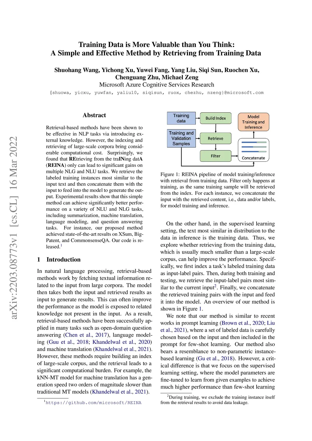Retrieval-based methods have been shown to be effective in NLP tasks via introducing external knowledge. However, the indexing and retrieving of large-scale corpora bring considerable computational cost. Surprisingly, we found that REtrieving from the traINing datA (REINA) only can lead to significant gains on multiple NLG and NLU tasks. We retrieve the labeled training instances most similar to the input text and then concatenate them with the input to feed into the model to generate the output. Experimental results show that this simple method can achieve significantly better performance on a variety of NLU and NLG tasks, including summarization, machine translation, language modeling, and question answering tasks. For instance, our proposed method achieved state-of-the-art results on XSum, BigPatent, and CommonsenseQA. Our code is released, https://github.com/microsoft/REINA .