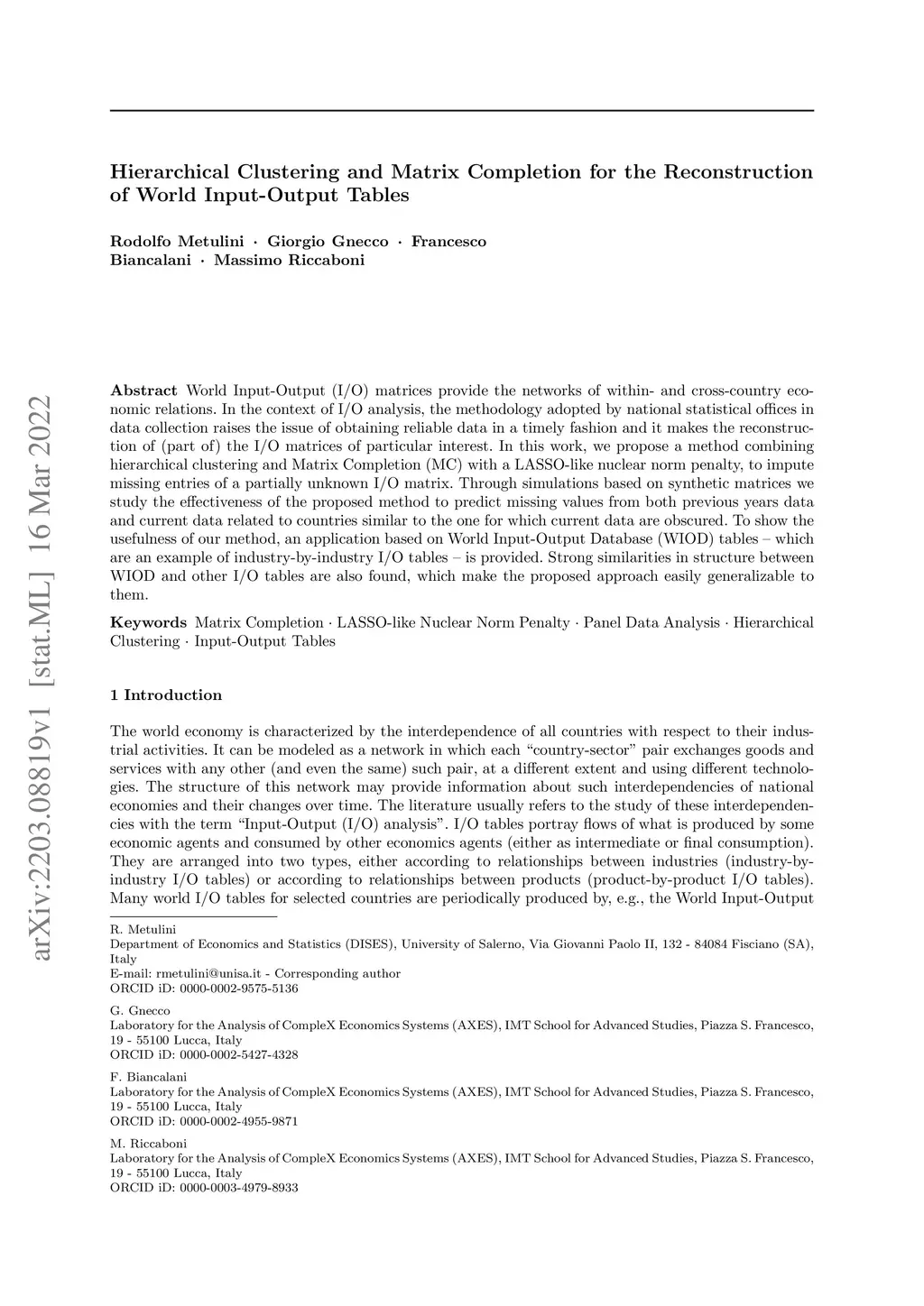 World Input-Output (I/O) matrices provide the networks of within- and cross-country economic relations. In the context of I/O analysis, the methodology adopted by national statistical offices in data collection raises the issue of obtaining reliable data in a timely fashion and it makes the reconstruction of (part of) the I/O matrices of particular interest. In this work, we propose a method combining hierarchical clustering and Matrix Completion (MC) with a LASSO-like nuclear norm penalty, to impute missing entries of a partially unknown I/O matrix. Through simulations based on synthetic matrices we study the effectiveness of the proposed method to predict missing values from both previous years data and current data related to countries similar to the one for which current data are obscured. To show the usefulness of our method, an application based on World Input-Output Database (WIOD) tables - which are an example of industry-by-industry I/O tables - is provided. Strong similarities in structure between WIOD and other I/O tables are also found, which make the proposed approach easily generalizable to them.