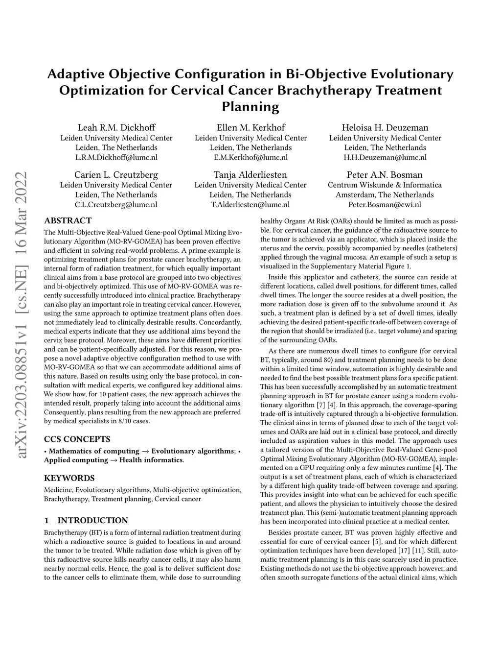 The Multi-Objective Real-Valued Gene-pool Optimal Mixing Evolutionary Algorithm (MO-RV-GOMEA) has been proven effective and efficient in solving real-world problems. A prime example is optimizing treatment plans for prostate cancer brachytherapy, an internal form of radiation treatment, for which equally important clinical aims from a base protocol are grouped into two objectives and bi-objectively optimized. This use of MO-RV-GOMEA was recently successfully introduced into clinical practice. Brachytherapy can also play an important role in treating cervical cancer. However, using the same approach to optimize treatment plans often does not immediately lead to clinically desirable results. Concordantly, medical experts indicate that they use additional aims beyond the cervix base protocol. Moreover, these aims have different priorities and can be patient-specifically adjusted. For this reason, we propose a novel adaptive objective configuration method to use with MO-RV-GOMEA so that we can accommodate additional aims of this nature. Based on results using only the base protocol, in consultation with medical experts, we configured key additional aims. We show how, for 10 patient cases, the new approach achieves the intended result, properly taking into account the additional aims. Consequently, plans resulting from the new approach are preferred by medical specialists in 8/10 cases.