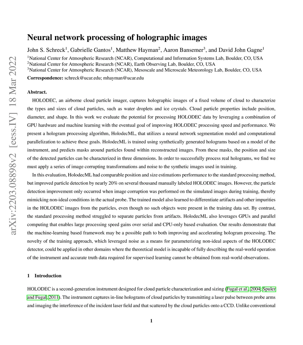 HOLODEC, an airborne cloud particle imager, captures holographic images of a fixed volume of cloud to characterize the types and sizes of cloud particles, such as water droplets and ice crystals. Cloud particle properties include position, diameter, and shape. We present a hologram processing algorithm, HolodecML, that utilizes a neural segmentation model, GPUs, and computational parallelization. HolodecML is trained using synthetically generated holograms based on a model of the instrument, and predicts masks around particles found within reconstructed images. From these masks, the position and size of the detected particles can be characterized in three dimensions. In order to successfully process real holograms, we find we must apply a series of image corrupting transformations and noise to the synthetic images used in training. In this evaluation, HolodecML had comparable position and size estimation performance to the standard processing method, but improved particle detection by nearly 20\% on several thousand manually labeled HOLODEC images. However, the improvement only occurred when image corruption was performed on the simulated images during training, thereby mimicking non-ideal conditions in the actual probe. The trained model also learned to differentiate artifacts and other impurities in the HOLODEC images from the particles, even though no such objects were present in the training data set, while the standard processing method struggled to separate particles from artifacts. The novelty of the training approach, which leveraged noise as a means for parameterizing non-ideal aspects of the HOLODEC detector, could be applied in other domains where the theoretical model is incapable of fully describing the real-world operation of the instrument and accurate truth data required for supervised learning cannot be obtained from real-world observations.