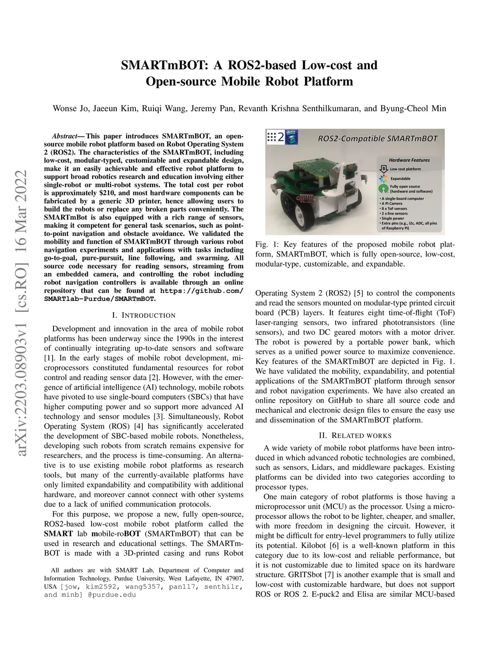 This paper introduces SMARTmBOT, an open-source mobile robot platform based on Robot Operating System 2 (ROS2). The characteristics of the SMARTmBOT, including low-cost, modular-typed, customizable and expandable design, make it an easily achievable and effective robot platform to support broad robotics research and education involving either single-robot or multi-robot systems. The total cost per robot is approximately $210, and most hardware components can be fabricated by a generic 3D printer, hence allowing users to build the robots or replace any broken parts conveniently. The SMARTmBot is also equipped with a rich range of sensors, making it competent for general task scenarios, such as point-to-point navigation and obstacle avoidance. We validated the mobility and function of SMARTmBOT through various robot navigation experiments and applications with tasks including go-to-goal, pure-pursuit, line following, and swarming. All source code necessary for reading sensors, streaming from an embedded camera, and controlling the robot including robot navigation controllers is available through an online repository that can be found at https://github.com/SMARTlab-Purdue/SMARTmBOT.