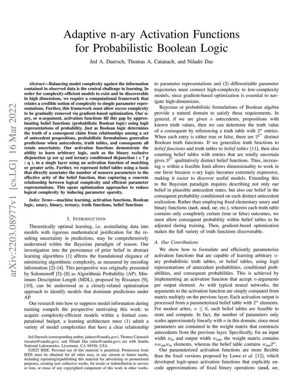 Balancing model complexity against the information contained in observed data is the central challenge to learning. In order for complexity-efficient models to exist and be discoverable in high dimensions, we require a computational framework that relates a credible notion of complexity to simple parameter representations. Further, this framework must allow excess complexity to be gradually removed via gradient-based optimization. Our n-ary, or n-argument, activation functions fill this gap by approximating belief functions (probabilistic Boolean logic) using logit representations of probability. Just as Boolean logic determines the truth of a consequent claim from relationships among a set of antecedent propositions, probabilistic formulations generalize predictions when antecedents, truth tables, and consequents all retain uncertainty. Our activation functions demonstrate the ability to learn arbitrary logic, such as the binary exclusive disjunction (p xor q) and ternary conditioned disjunction ( c ? p : q ), in a single layer using an activation function of matching or greater arity. Further, we represent belief tables using a basis that directly associates the number of nonzero parameters to the effective arity of the belief function, thus capturing a concrete relationship between logical complexity and efficient parameter representations. This opens optimization approaches to reduce logical complexity by inducing parameter sparsity.