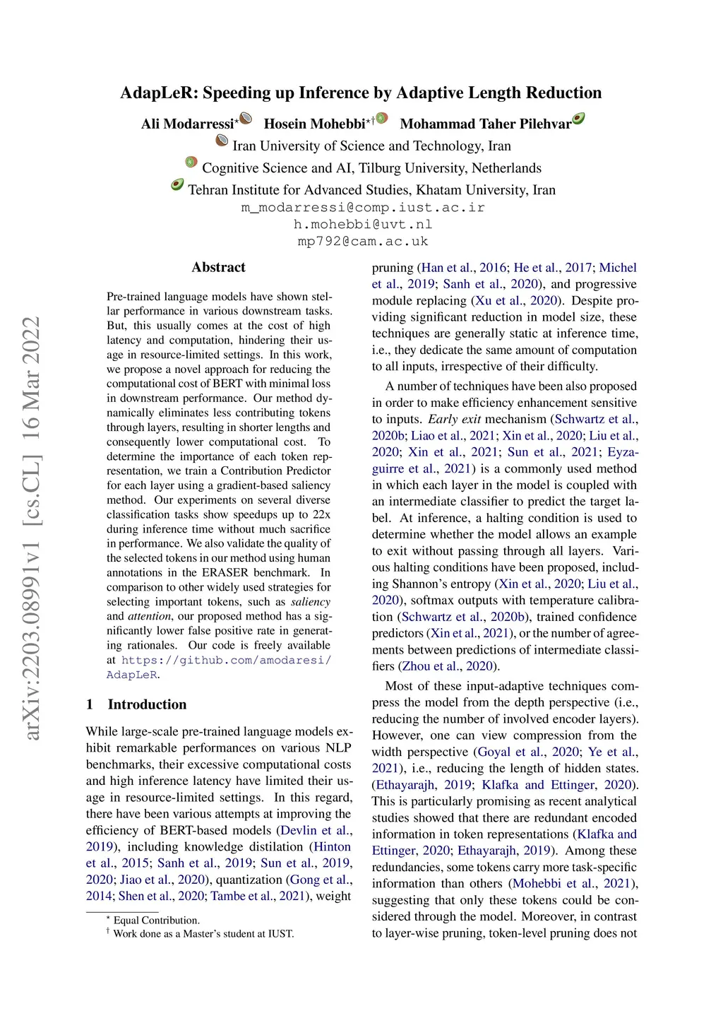 Pre-trained language models have shown stellar performance in various downstream tasks. But, this usually comes at the cost of high latency and computation, hindering their usage in resource-limited settings. In this work, we propose a novel approach for reducing the computational cost of BERT with minimal loss in downstream performance. Our method dynamically eliminates less contributing tokens through layers, resulting in shorter lengths and consequently lower computational cost. To determine the importance of each token representation, we train a Contribution Predictor for each layer using a gradient-based saliency method. Our experiments on several diverse classification tasks show speedups up to 22x during inference time without much sacrifice in performance. We also validate the quality of the selected tokens in our method using human annotations in the ERASER benchmark. In comparison to other widely used strategies for selecting important tokens, such as saliency and attention, our proposed method has a significantly lower false positive rate in generating rationales. Our code is freely available at https://github.com/amodaresi/AdapLeR .