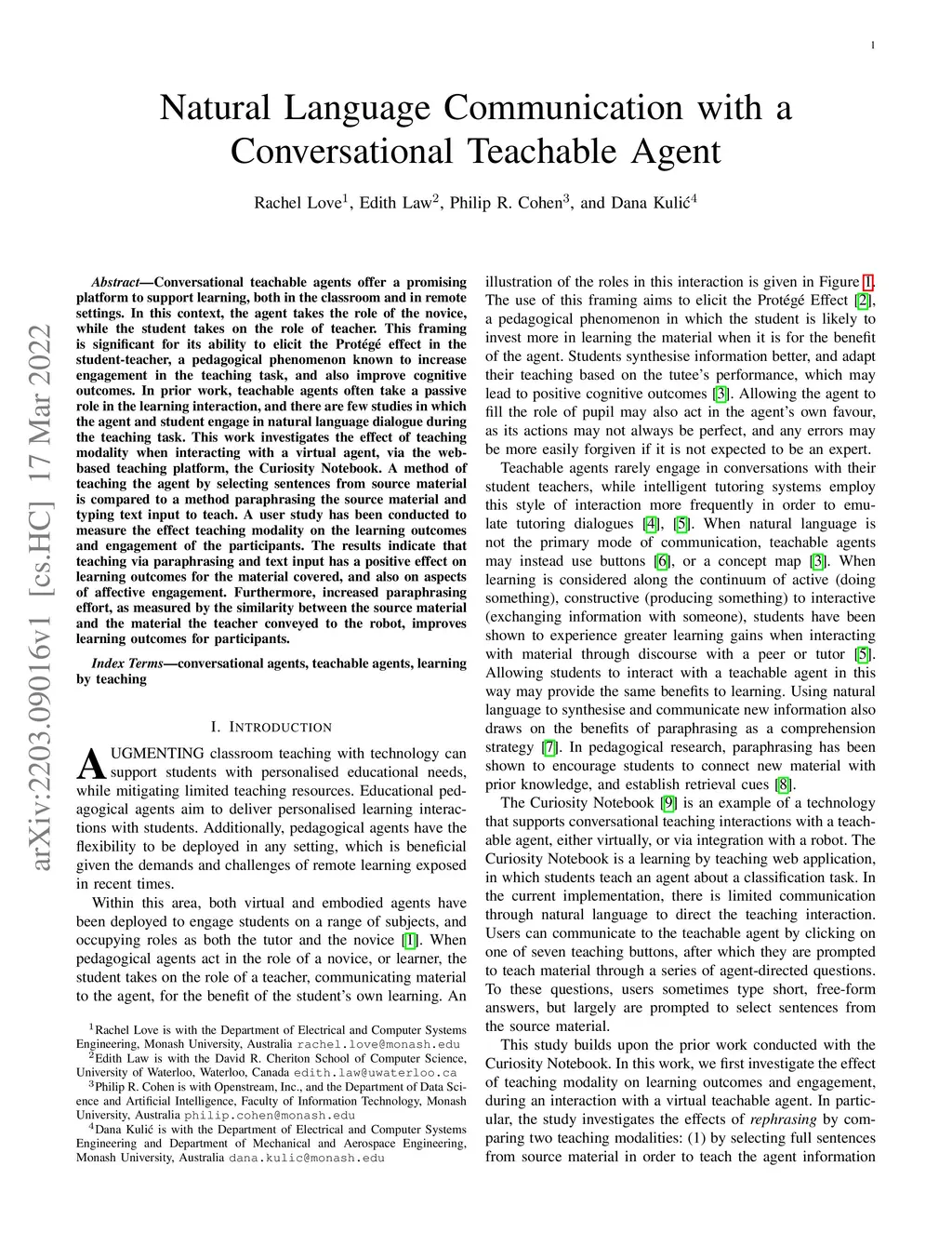 Conversational teachable agents offer a promising platform to support learning, both in the classroom and in remote settings. In this context, the agent takes the role of the novice, while the student takes on the role of teacher. This framing is significant for its ability to elicit the Prot\ég\é effect in the student-teacher, a pedagogical phenomenon known to increase engagement in the teaching task, and also improve cognitive outcomes. In prior work, teachable agents often take a passive role in the learning interaction, and there are few studies in which the agent and student engage in natural language dialogue during the teaching task. This work investigates the effect of teaching modality when interacting with a virtual agent, via the web-based teaching platform, the Curiosity Notebook. A method of teaching the agent by selecting sentences from source material is compared to a method paraphrasing the source material and typing text input to teach. A user study has been conducted to measure the effect teaching modality on the learning outcomes and engagement of the participants. The results indicate that teaching via paraphrasing and text input has a positive effect on learning outcomes for the material covered, and also on aspects of affective engagement. Furthermore, increased paraphrasing effort, as measured by the similarity between the source material and the material the teacher conveyed to the robot, improves learning outcomes for participants.