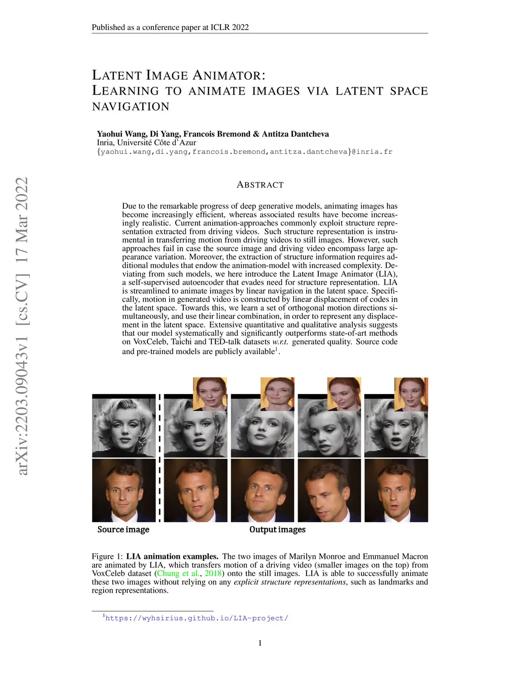 Due to the remarkable progress of deep generative models, animating images has become increasingly efficient, whereas associated results have become increasingly realistic. Current animation-approaches commonly exploit structure representation extracted from driving videos. Such structure representation is instrumental in transferring motion from driving videos to still images. However, such approaches fail in case the source image and driving video encompass large appearance variation. Moreover, the extraction of structure information requires additional modules that endow the animation-model with increased complexity. Deviating from such models, we here introduce the Latent Image Animator (LIA), a self-supervised autoencoder that evades need for structure representation. LIA is streamlined to animate images by linear navigation in the latent space. Specifically, motion in generated video is constructed by linear displacement of codes in the latent space. Towards this, we learn a set of orthogonal motion directions simultaneously, and use their linear combination, in order to represent any displacement in the latent space. Extensive quantitative and qualitative analysis suggests that our model systematically and significantly outperforms state-of-art methods on VoxCeleb, Taichi and TED-talk datasets w.r.t. generated quality.