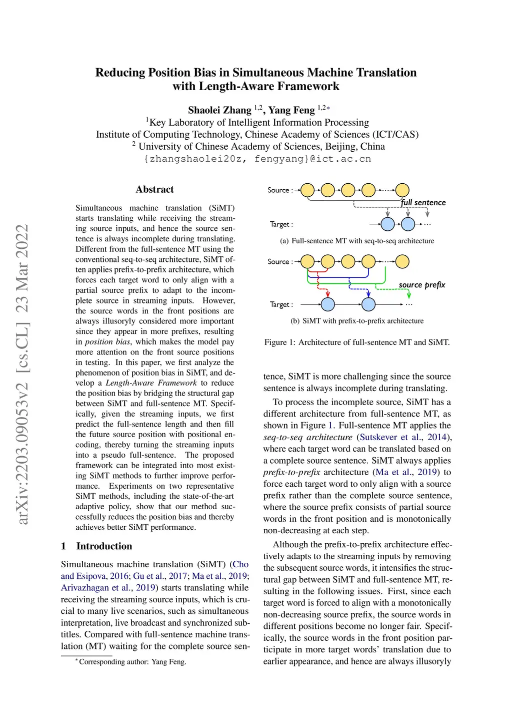 Simultaneous machine translation (SiMT) starts translating while receiving the streaming source inputs, and hence the source sentence is always incomplete during translating. Different from the full-sentence MT using the conventional seq-to-seq architecture, SiMT often applies prefix-to-prefix architecture, which forces each target word to only align with a partial source prefix to adapt to the incomplete source in streaming inputs. However, the source words in the front positions are always illusoryly considered more important since they appear in more prefixes, resulting in position bias, which makes the model pay more attention on the front source positions in testing. In this paper, we first analyze the phenomenon of position bias in SiMT, and develop a Length-Aware Framework to reduce the position bias by bridging the structural gap between SiMT and full-sentence MT. Specifically, given the streaming inputs, we first predict the full-sentence length and then fill the future source position with positional encoding, thereby turning the streaming inputs into a pseudo full-sentence. The proposed framework can be integrated into most existing SiMT methods to further improve performance. Experiments on two representative SiMT methods, including the state-of-the-art adaptive policy, show that our method successfully reduces the position bias and thereby achieves better SiMT performance.