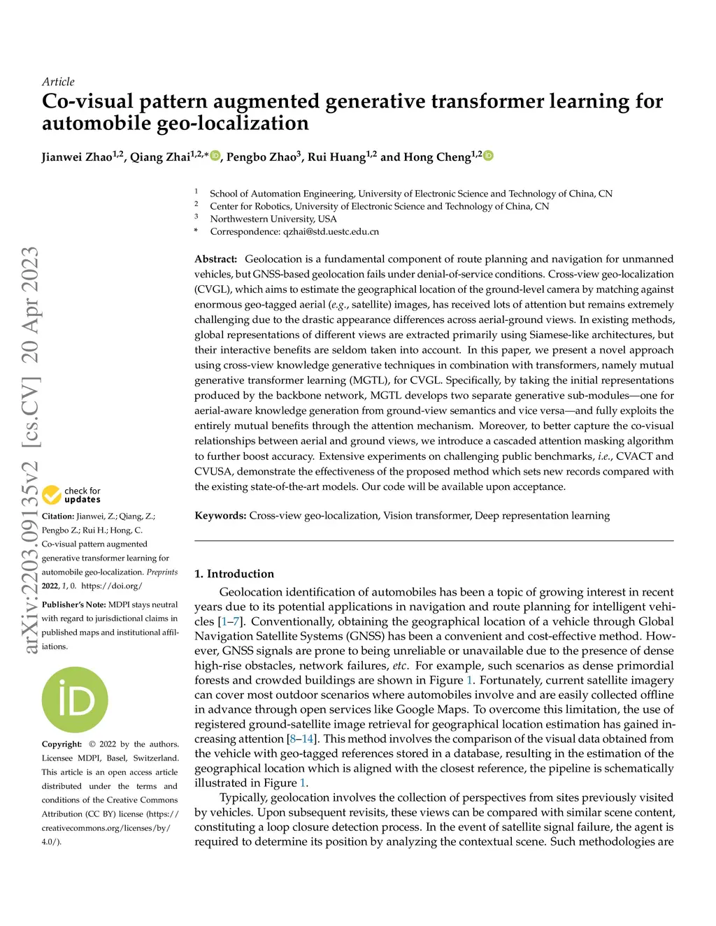Geolocation is a fundamental component of route planning and navigation for unmanned vehicles, but GNSS-based geolocation fails under denial-of-service conditions. Cross-view geo-localization (CVGL), which aims to estimate the geographical location of the ground-level camera by matching against enormous geo-tagged aerial (\emph{e.g.}, satellite) images, has received lots of attention but remains extremely challenging due to the drastic appearance differences across aerial-ground views. In existing methods, global representations of different views are extracted primarily using Siamese-like architectures, but their interactive benefits are seldom taken into account. In this paper, we present a novel approach using cross-view knowledge generative techniques in combination with transformers, namely mutual generative transformer learning (MGTL), for CVGL. Specifically, by taking the initial representations produced by the backbone network, MGTL develops two separate generative sub-modules -- one for aerial-aware knowledge generation from ground-view semantics and vice versa -- and fully exploits the entirely mutual benefits through the attention mechanism. Moreover, to better capture the co-visual relationships between aerial and ground views, we introduce a cascaded attention masking algorithm to further boost accuracy. Extensive experiments on challenging public benchmarks, \emph{i.e.}, {CVACT} and {CVUSA}, demonstrate the effectiveness of the proposed method which sets new records compared with the existing state-of-the-art models.