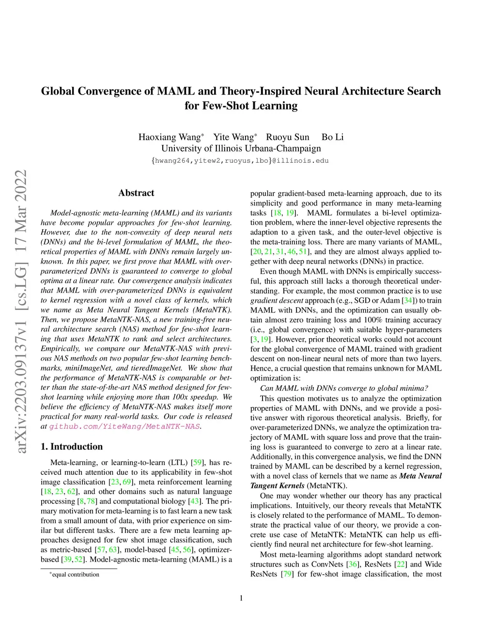 Model-agnostic meta-learning (MAML) and its variants have become popular approaches for few-shot learning. However, due to the non-convexity of deep neural nets (DNNs) and the bi-level formulation of MAML, the theoretical properties of MAML with DNNs remain largely unknown. In this paper, we first prove that MAML with over-parameterized DNNs is guaranteed to converge to global optima at a linear rate. Our convergence analysis indicates that MAML with over-parameterized DNNs is equivalent to kernel regression with a novel class of kernels, which we name as Meta Neural Tangent Kernels (MetaNTK). Then, we propose MetaNTK-NAS, a new training-free neural architecture search (NAS) method for few-shot learning that uses MetaNTK to rank and select architectures. Empirically, we compare our MetaNTK-NAS with previous NAS methods on two popular few-shot learning benchmarks, miniImageNet, and tieredImageNet. We show that the performance of MetaNTK-NAS is comparable or better than the state-of-the-art NAS method designed for few-shot learning while enjoying more than 100x speedup. We believe the efficiency of MetaNTK-NAS makes itself more practical for many real-world tasks.