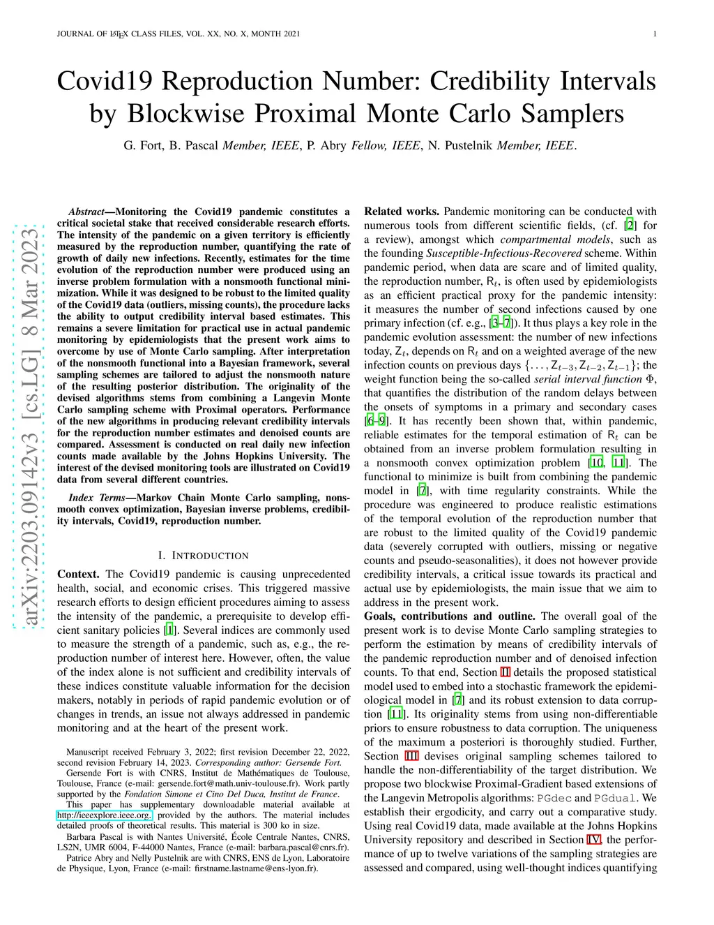 Monitoring the Covid19 pandemic constitutes a critical societal stake that received considerable research efforts. The intensity of the pandemic on a given territory is efficiently measured by the reproduction number, quantifying the rate of growth of daily new infections. Recently, estimates for the time evolution of the reproduction number were produced using an inverse problem formulation with a nonsmooth functional minimization. While it was designed to be robust to the limited quality of the Covid19 data (outliers, missing counts), the procedure lacks the ability to output credibility interval based estimates. This remains a severe limitation for practical use in actual pandemic monitoring by epidemiologists that the present work aims to overcome by use of Monte Carlo sampling. After interpretation of the nonsmooth functional into a Bayesian framework, several sampling schemes are tailored to adjust the nonsmooth nature of the resulting posterior distribution. The originality of the devised algorithms stems from combining a Langevin Monte Carlo sampling scheme with Proximal operators. Performance of the new algorithms in producing relevant credibility intervals for the reproduction number estimates and denoised counts are compared. Assessment is conducted on real daily new infection counts made available by the Johns Hopkins University. The interest of the devised monitoring tools are illustrated on Covid19 data from several different countries.