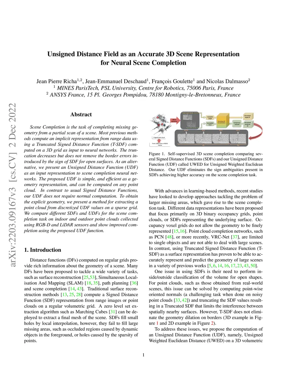 Scene Completion is the task of completing missing geometry from a partial scan of a scene. Most previous methods compute an implicit representation from range data using a Truncated Signed Distance Function (T-SDF) computed on a 3D grid as input to neural networks. The truncation decreases but does not remove the border errors introduced by the sign of SDF for open surfaces. As an alternative, we present an Unsigned Distance Function (UDF) as an input representation to scene completion neural networks. The proposed UDF is simple, and efficient as a geometry representation, and can be computed on any point cloud. In contrast to usual Signed Distance Functions, our UDF does not require normal computation. To obtain the explicit geometry, we present a method for extracting a point cloud from discretized UDF values on a sparse grid. We compare different SDFs and UDFs for the scene completion task on indoor and outdoor point clouds collected using RGB-D and LiDAR sensors and show improved completion using the proposed UDF function.