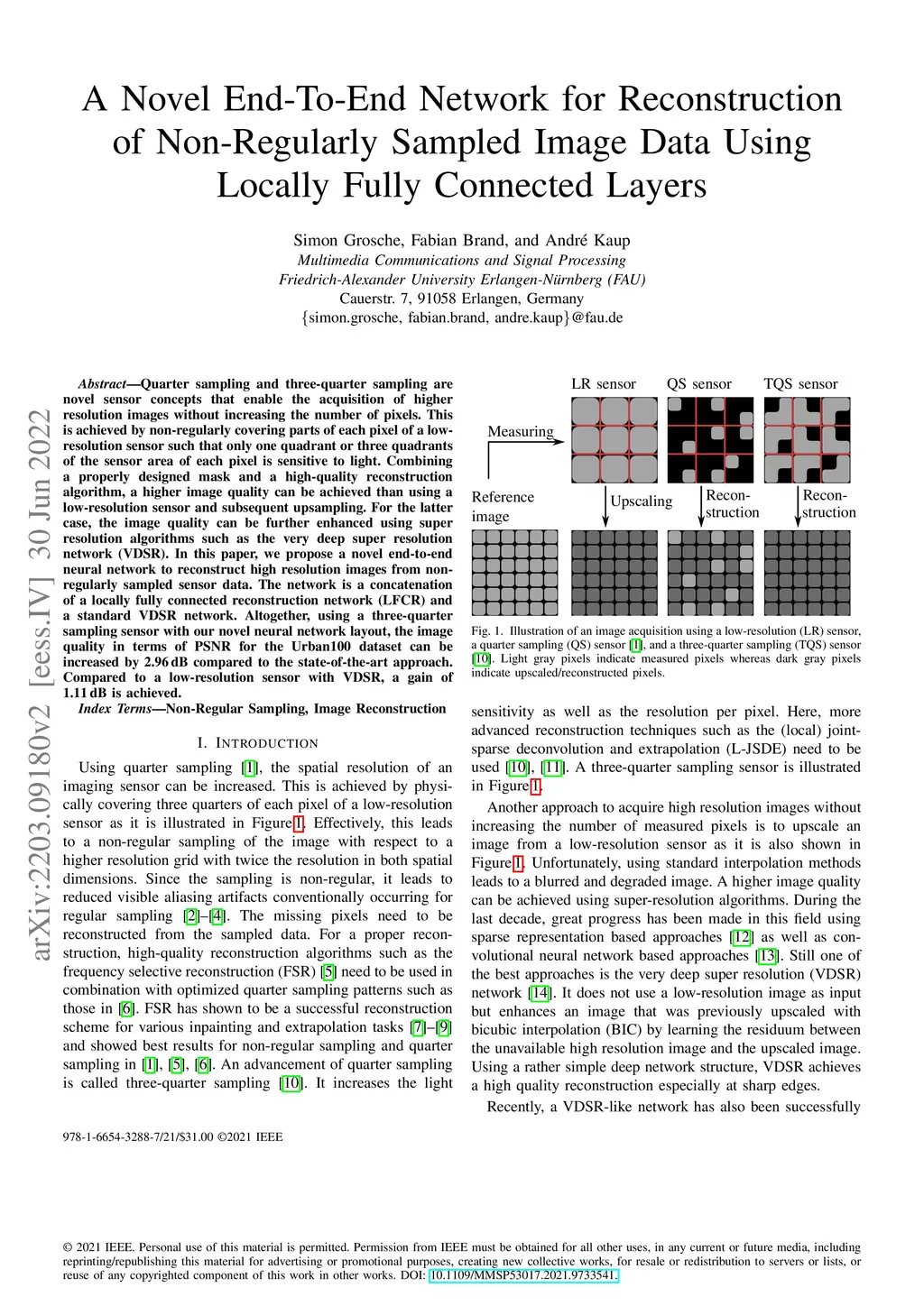 Quarter sampling and three-quarter sampling are novel sensor concepts that enable the acquisition of higher resolution images without increasing the number of pixels. This is achieved by non-regularly covering parts of each pixel of a low-resolution sensor such that only one quadrant or three quadrants of the sensor area of each pixel is sensitive to light. Combining a properly designed mask and a high-quality reconstruction algorithm, a higher image quality can be achieved than using a low-resolution sensor and subsequent upsampling. For the latter case, the image quality can be further enhanced using super resolution algorithms such as the very deep super resolution network (VDSR). In this paper, we propose a novel end-to-end neural network to reconstruct high resolution images from non-regularly sampled sensor data. The network is a concatenation of a locally fully connected reconstruction network (LFCR) and a standard VDSR network. Altogether, using a three-quarter sampling sensor with our novel neural network layout, the image quality in terms of PSNR for the Urban100 dataset can be increased by 2.96 dB compared to the state-of-the-art approach. Compared to a low-resolution sensor with VDSR, a gain of 1.11 dB is achieved.