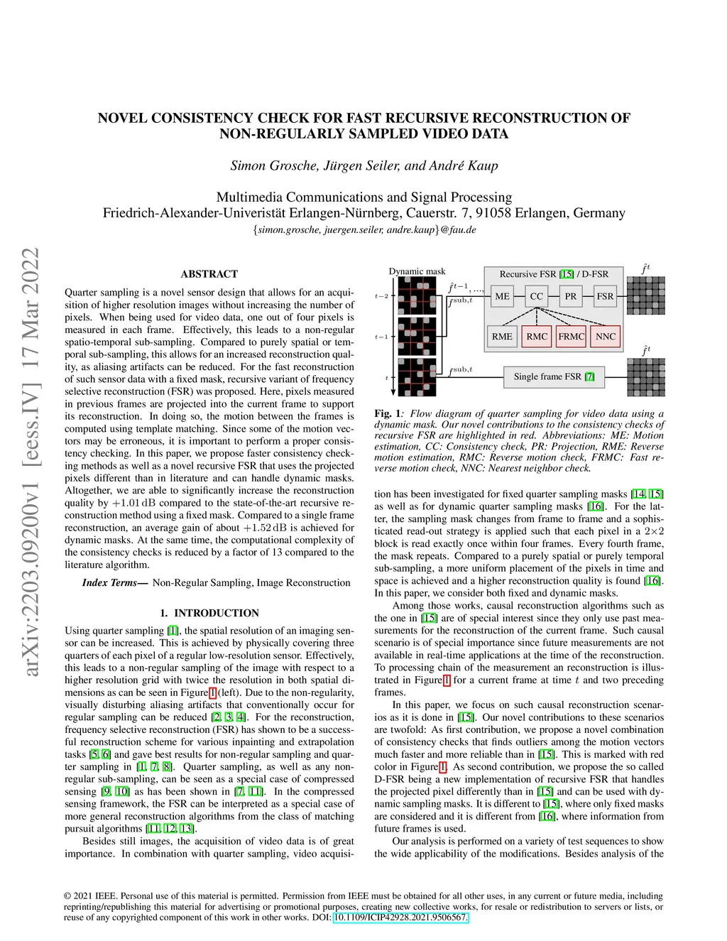 Quarter sampling is a novel sensor design that allows for an acquisition of higher resolution images without increasing the number of pixels. When being used for video data, one out of four pixels is measured in each frame. Effectively, this leads to a non-regular spatio-temporal sub-sampling. Compared to purely spatial or temporal sub-sampling, this allows for an increased reconstruction quality, as aliasing artifacts can be reduced. For the fast reconstruction of such sensor data with a fixed mask, recursive variant of frequency selective reconstruction (FSR) was proposed. Here, pixels measured in previous frames are projected into the current frame to support its reconstruction. In doing so, the motion between the frames is computed using template matching. Since some of the motion vectors may be erroneous, it is important to perform a proper consistency checking. In this paper, we propose faster consistency checking methods as well as a novel recursive FSR that uses the projected pixels different than in literature and can handle dynamic masks. Altogether, we are able to significantly increase the reconstruction quality by + 1.01 dB compared to the state-of-the-art recursive reconstruction method using a fixed mask. Compared to a single frame reconstruction, an average gain of about + 1.52 dB is achieved for dynamic masks. At the same time, the computational complexity of the consistency checks is reduced by a factor of 13 compared to the literature algorithm.