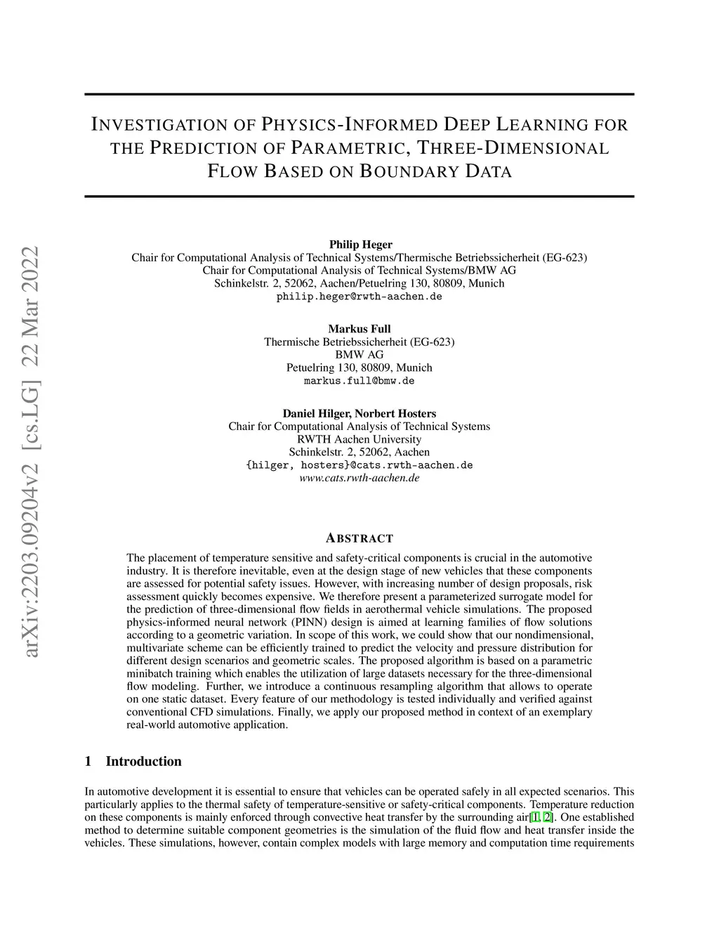 The placement of temperature sensitive and safety-critical components is crucial in the automotive industry. It is therefore inevitable, even at the design stage of new vehicles that these components are assessed for potential safety issues. However, with increasing number of design proposals, risk assessment quickly becomes expensive. We therefore present a parameterized surrogate model for the prediction of three-dimensional flow fields in aerothermal vehicle simulations. The proposed physics-informed neural network (PINN) design is aimed at learning families of flow solutions according to a geometric variation. In scope of this work, we could show that our nondimensional, multivariate scheme can be efficiently trained to predict the velocity and pressure distribution for different design scenarios and geometric scales. The proposed algorithm is based on a parametric minibatch training which enables the utilization of large datasets necessary for the three-dimensional flow modeling. Further, we introduce a continuous resampling algorithm that allows to operate on one static dataset. Every feature of our methodology is tested individually and verified against conventional CFD simulations. Finally, we apply our proposed method in context of an exemplary real-world automotive application.