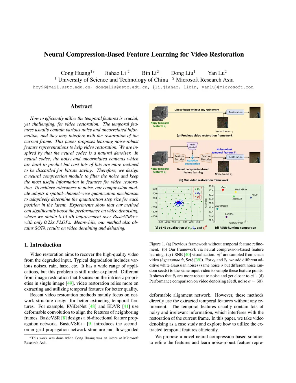 How to efficiently utilize the temporal features is crucial, yet challenging, for video restoration. The temporal features usually contain various noisy and uncorrelated information, and they may interfere with the restoration of the current frame. This paper proposes learning noise-robust feature representations to help video restoration. We are inspired by that the neural codec is a natural denoiser. In neural codec, the noisy and uncorrelated contents which are hard to predict but cost lots of bits are more inclined to be discarded for bitrate saving. Therefore, we design a neural compression module to filter the noise and keep the most useful information in features for video restoration. To achieve robustness to noise, our compression module adopts a spatial channel-wise quantization mechanism to adaptively determine the quantization step size for each position in the latent. Experiments show that our method can significantly boost the performance on video denoising, where we obtain 0.13 dB improvement over BasicVSR++ with only 0.23x FLOPs. Meanwhile, our method also obtains SOTA results on video deraining and dehazing.