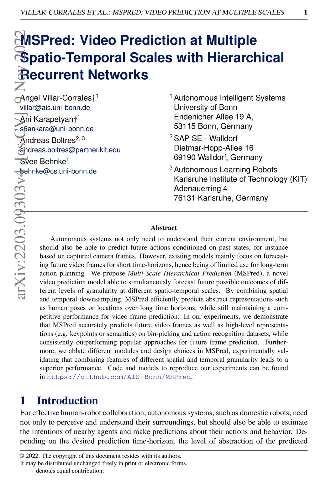 Autonomous systems not only need to understand their current environment, but should also be able to predict future actions conditioned on past states, for instance based on captured camera frames. However, existing models mainly focus on forecasting future video frames for short time-horizons, hence being of limited use for long-term action planning. We propose Multi-Scale Hierarchical Prediction (MSPred), a novel video prediction model able to simultaneously forecast future possible outcomes of different levels of granularity at different spatio-temporal scales. By combining spatial and temporal downsampling, MSPred efficiently predicts abstract representations such as human poses or locations over long time horizons, while still maintaining a competitive performance for video frame prediction. In our experiments, we demonstrate that MSPred accurately predicts future video frames as well as high-level representations (e.g. keypoints or semantics) on bin-picking and action recognition datasets, while consistently outperforming popular approaches for future frame prediction. Furthermore, we ablate different modules and design choices in MSPred, experimentally validating that combining features of different spatial and temporal granularity leads to a superior performance. Code and models to reproduce our experiments can be found in https://github.com/AIS-Bonn/MSPred.
